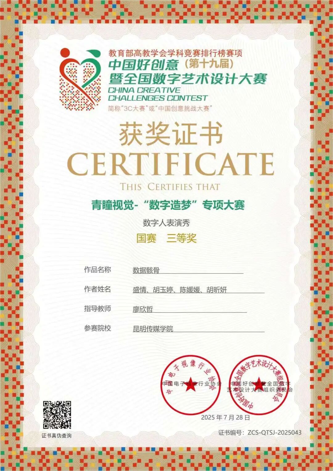 •2025年第十九届中国好创意暨全国数字艺术设计大赛-青瞳视觉“数字造梦”专项大赛-数字人表演秀 国赛 三等奖