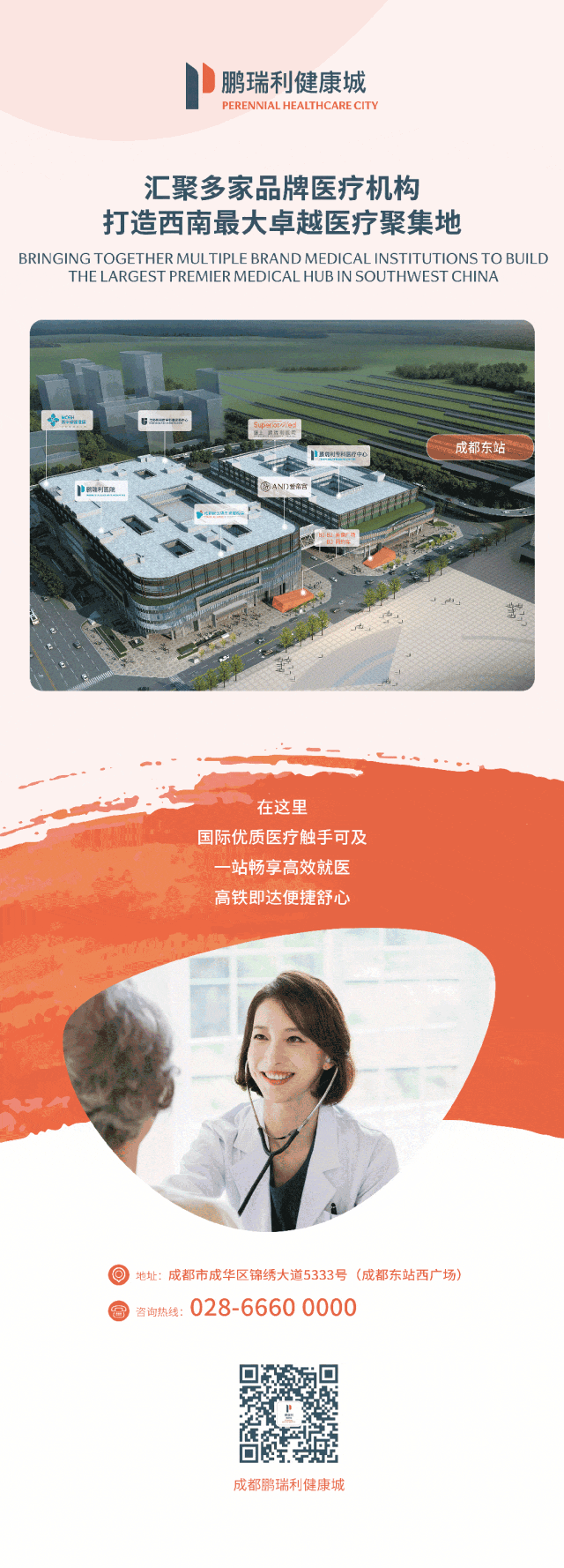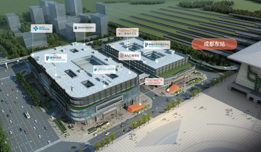 项目与高铁交通枢纽的成都东站西广场无缝衔接,依托于便捷交通,立足成都辐射西南,提供一站式优质、高效且便捷的医疗健康服务,是国内“医疗+商业”融合模式的创新标杆,也是西南地区高端健康生活新地标。