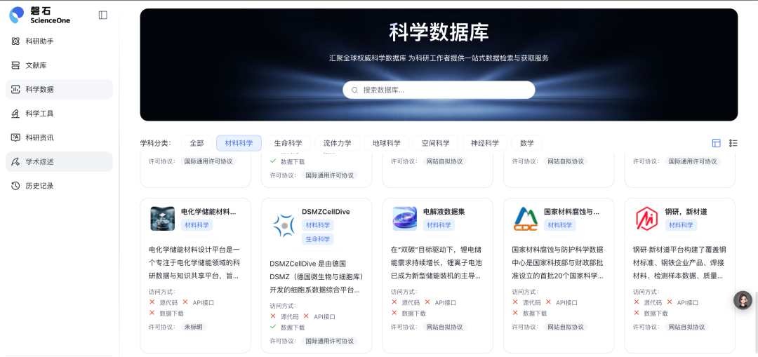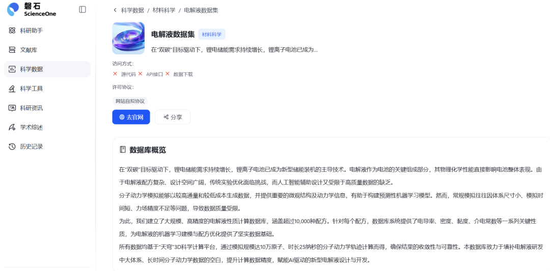 通过首页“科学数据”板块,点击“材料科学”模块,找到“电解液数据集”,点击进入查看数据集详情