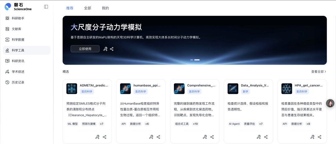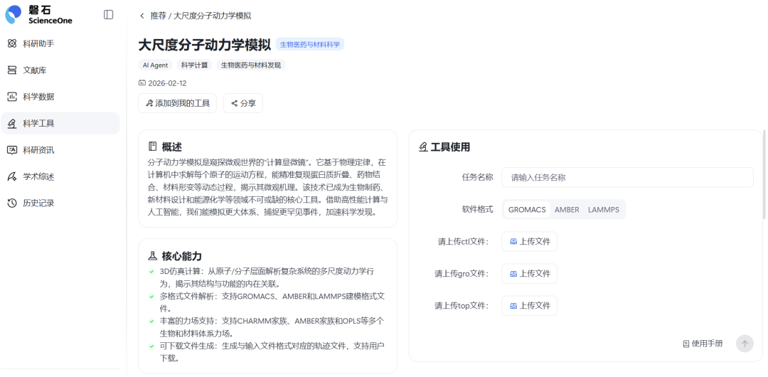 通过首页“科学工具”板块,找到“大尺度分子动力学模拟”工具,点击进入提交分子动力学模拟任务