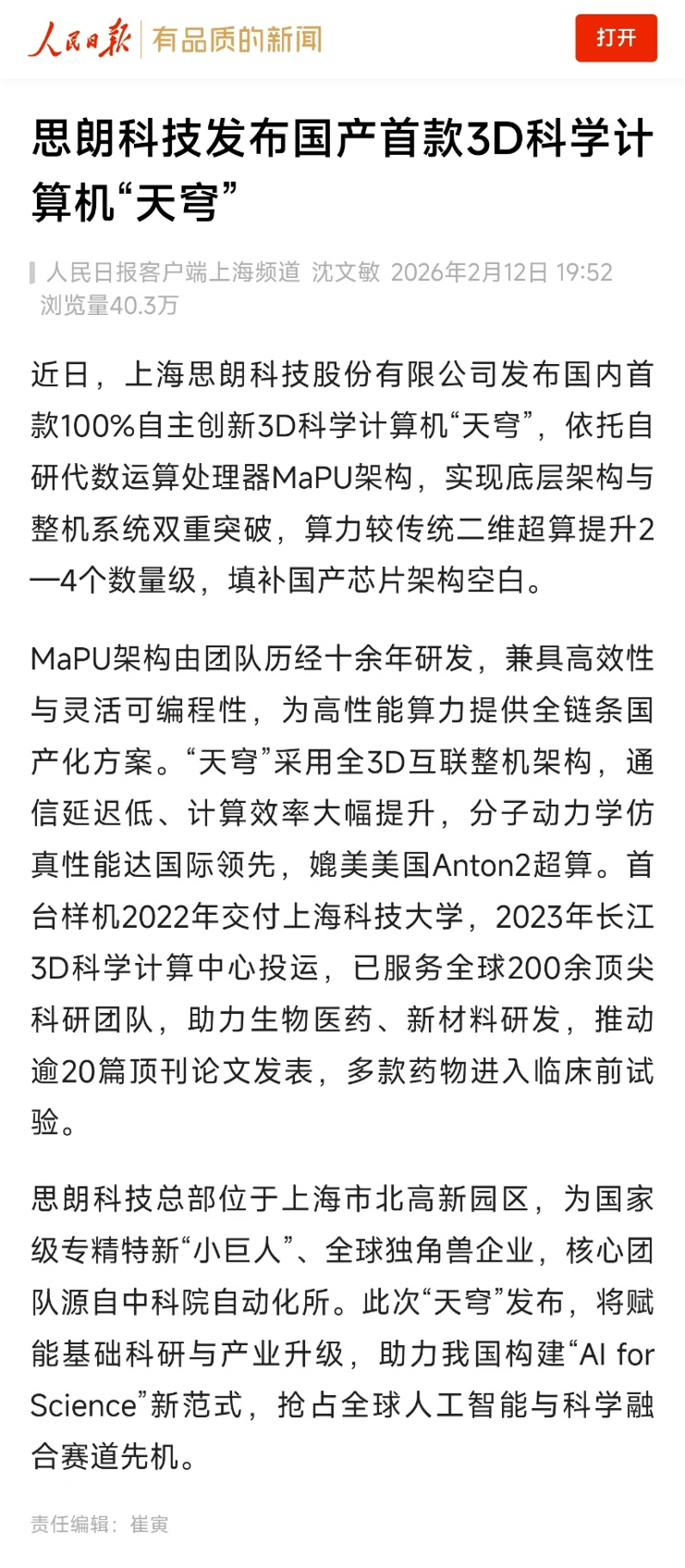 作为脱胎于中国科学院自动化研究所的高科技半导体独角兽企业,思朗科技始终秉持“为产业做超算,为智能谱数据”的初心,致力于为科学智能领域提供自主可控的算力基础设施与行业高质量科学数据集。此次人民日报的权威报道,不仅是对思朗科技十余年坚持自主创新道路的高度认可,更是激励公司继续以原创科技服务国家战略、践行科技报国使命的强大动力。