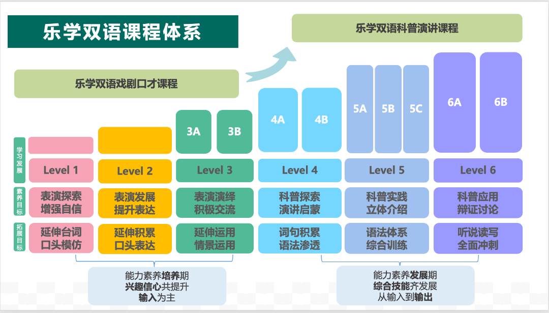 双语素养课程致力于把握 3-12 岁孩子的语言培养黄金期,把能力素养分为“培育期”和“发展期”,从兴趣信心共提升,到综合技能齐发展;从输入到输出,形成一个科学系统的语言学习体系。