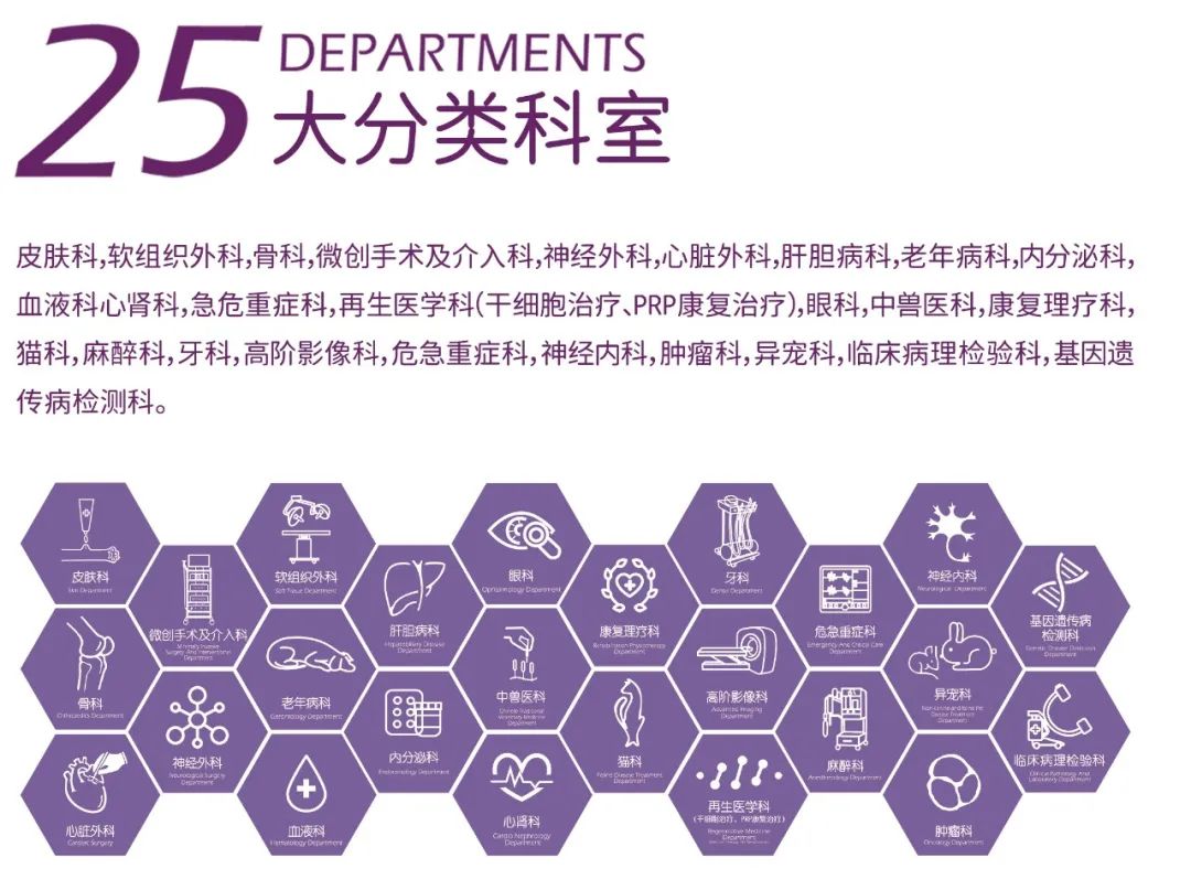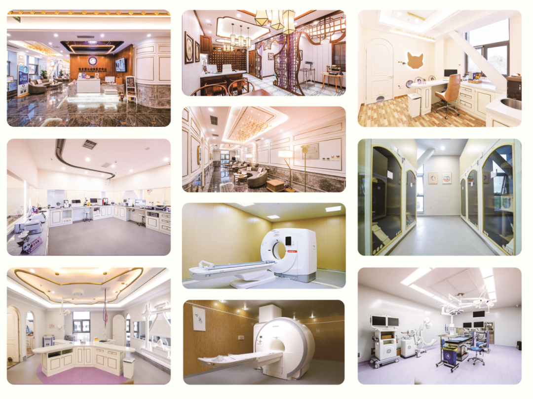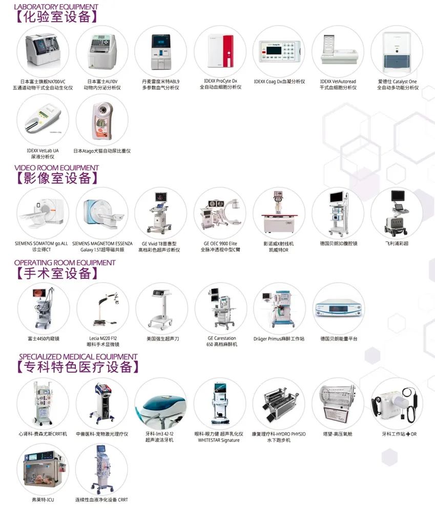 医疗中心占地面积约3000㎡,拥有15大专业化诊疗中心、25大分类科室,和约400㎡的宠物手术中心,配备千级洁净手术室*1、万级洁净手术室*2、负压牙科手术室*1。诊疗中心拥有众多知名医疗品牌设备,如SIEMENS ESSENZA 1.5T GALAXY 超导磁共振、SIEMENS SOMATOM Go 64排CT、GE Vivid T8高端心血管彩色超声、GE OEC 9900 Elite 全脉冲透视中型C臂、GE麻醉工作站、美国强生超声刀、富士4450内窥镜、WHITESTAR Signature超声乳化仪、Lecia M220 F12眼科手术显微镜、英国HYDRO PHYSIO水下跑步机等。