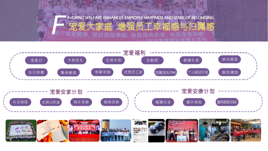 作为宠爱国际的家人,当然拥有各式各样的福利:除五险外,还会宠爱日聚会、中秋晚宴、定期团建、住房补助、带薪年假、工作满5年购房购车的无息贷款、重疾就医协助、以及股权激励等等。