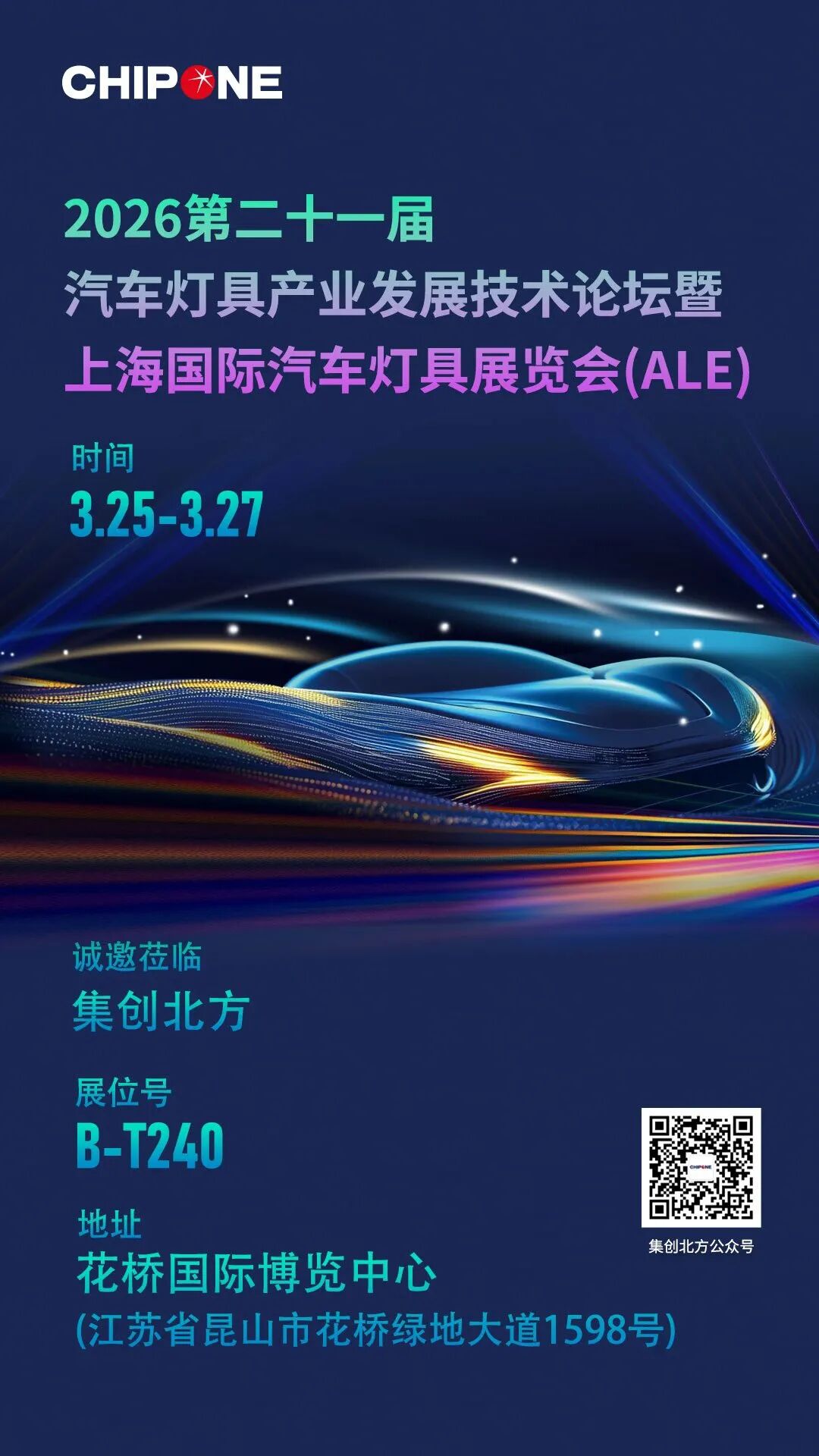 3月27日上午,集创北方还将亮相 2026 ALE「聚光・向新・求效」新品联合发布会,首发“智能座舱显示系统全芯片组解决方案”,并参与ALE 2026车灯论坛,诚邀您的莅临。