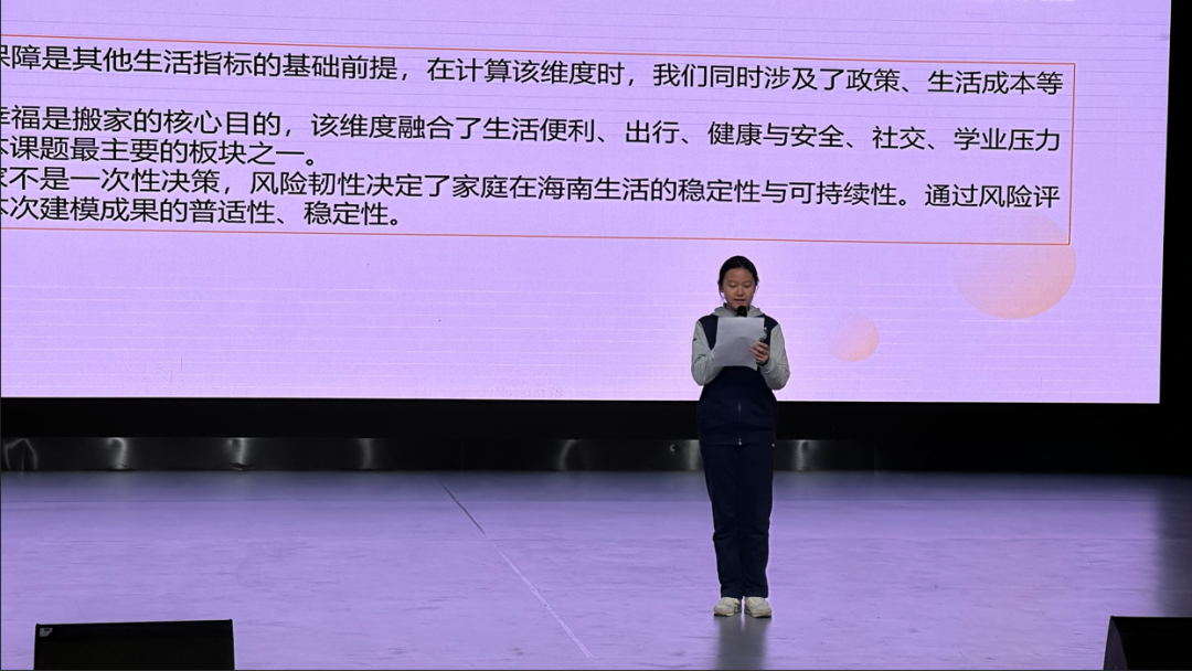 崔瑞镝、迟程、付雨鑫等同学的《海南封关背景下北京家庭的迁移决策方案》,从经济账、幸福账、风险评估三个维度,用数学建模、AHP 层次分析法量化分析迁移决策,让抽象的选择变成有数据支撑的科学判断。
