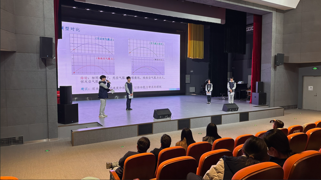 而最令人瞩目的TED 式课题成果分享环节,更是让全场沉浸在数理融合的科创盛宴中。曲芊雨、姜懿宸、邵馨毅、赵翰如等同学带来《篮球中的物理 —— 投篮的运动学建模》,从无空气阻力到恒定阻力、线性空气阻力,层层迭代建模,推导投篮轨迹公式,用数学与物理知识解锁投篮的科学奥秘。