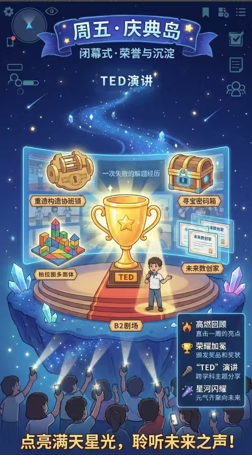 一周的时光短暂,却让数学的种子在每一个晋元学子心中生根发芽。从古老的浑天仪到现代的 AI 演算,从古诗文的字里行间到运动赛场的投掷瞬间,从实验室的前沿研究到校园里的趣味探索,再到闭幕式上精彩纷呈的课题展示,数学无处不在,魅力无限。
