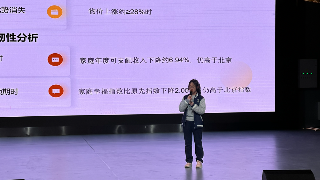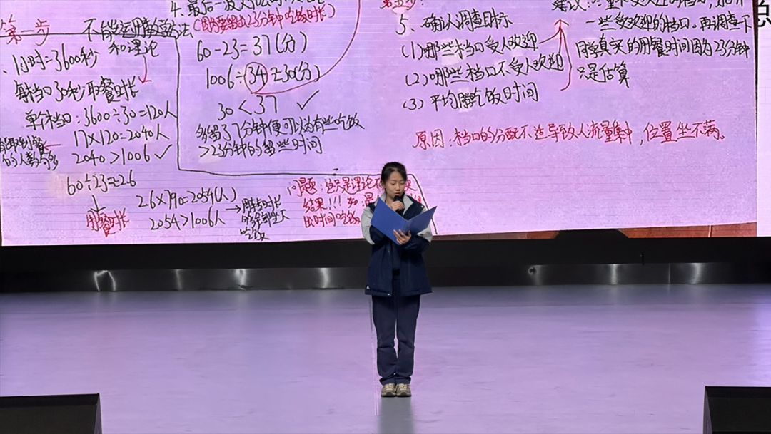 陈思言同学聚焦校园生活,带来《优化食堂系统的数学 “解”》,通过座位动态记录、数据交叉验证,用数学方法分析食堂人流问题,设计信息可视化解决方案,让数学成为解决校园实际问题的利器。
