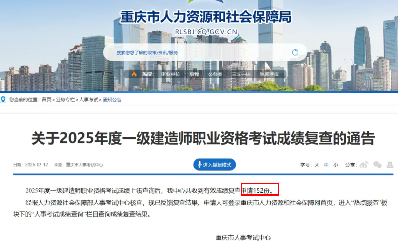 2025年度一级建造师职业资格考试成绩上线查询后,我中心共收到有效成绩复查申请152份。经报人力资源社会保障部人事考试中心核查,现已反馈复查结果。申请人可登录重庆市人力资源和社会保障网首页,进入“热点服务”板块下的"人事考试成绩查询"栏目查询成绩复查结果。