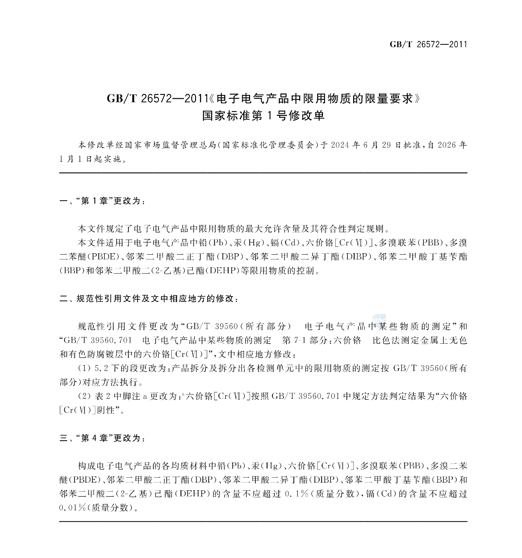 2026年1月1日起,根据国家市场监督管理总局2024年第14号国家标准公告,中国RoHS配套标准《电子电气产品中限用物质的限量要求》GB/T 26572-2011《第1号修改单》正式实施,且检测方法同步更新为GB/T 39560系列标准。