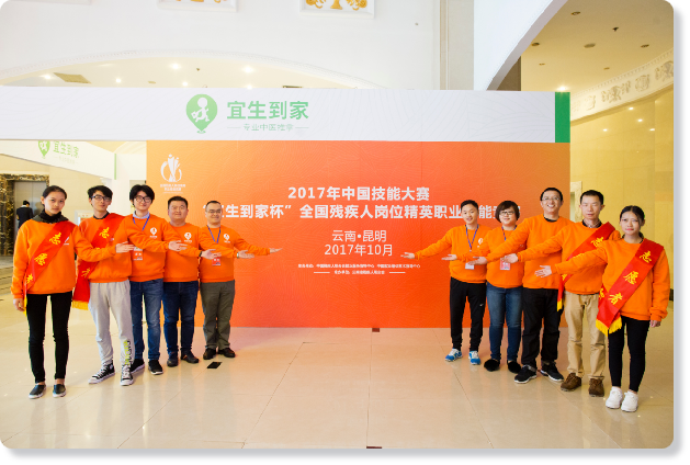 2017年,由宜生无忧独家冠名的中国技能大赛“宜生到家杯”全国残疾人岗位精英职业技能竞赛现场,宜生无忧全体工作人员合影留念。
