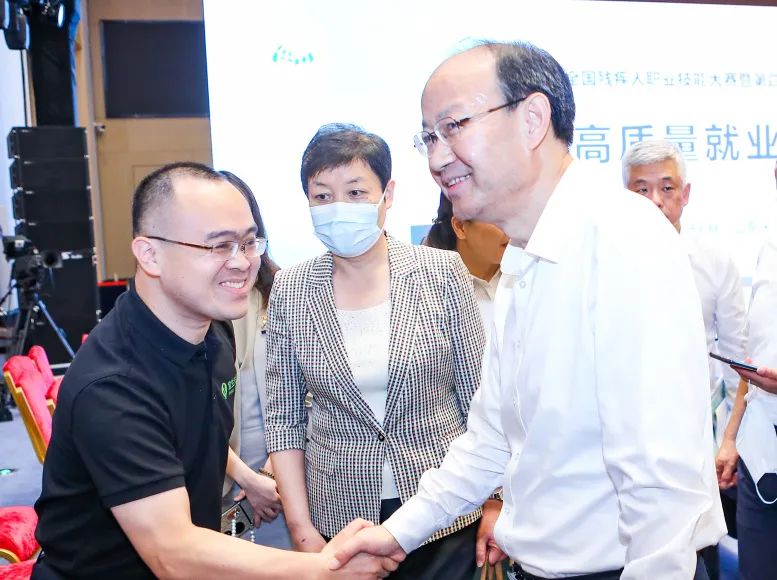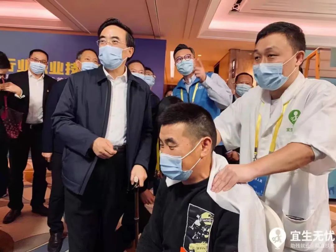 2021年,全国残疾人岗位精英职业技能竞赛暨全国残疾人就业服务机构工作人员职业指导竞赛现场,时任中国残联第七届主席团副主席程凯参观宜生无忧盲人按摩体验区并与残疾人技师亲切交流。