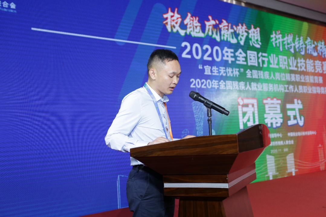 2020年,由宜生无忧独家冠名的全国残疾人岗位精英职业技能竞赛暨全国残疾人就业服务机构工作人员职业指导竞赛闭幕式现场,宜生无忧董事长孙金政做现场分享发言。