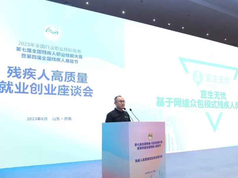 右图:宜生无忧总裁周敏在残疾人高质量就业创业座谈会上作专题分享,得到与会全国各地残联领导的高度认可。