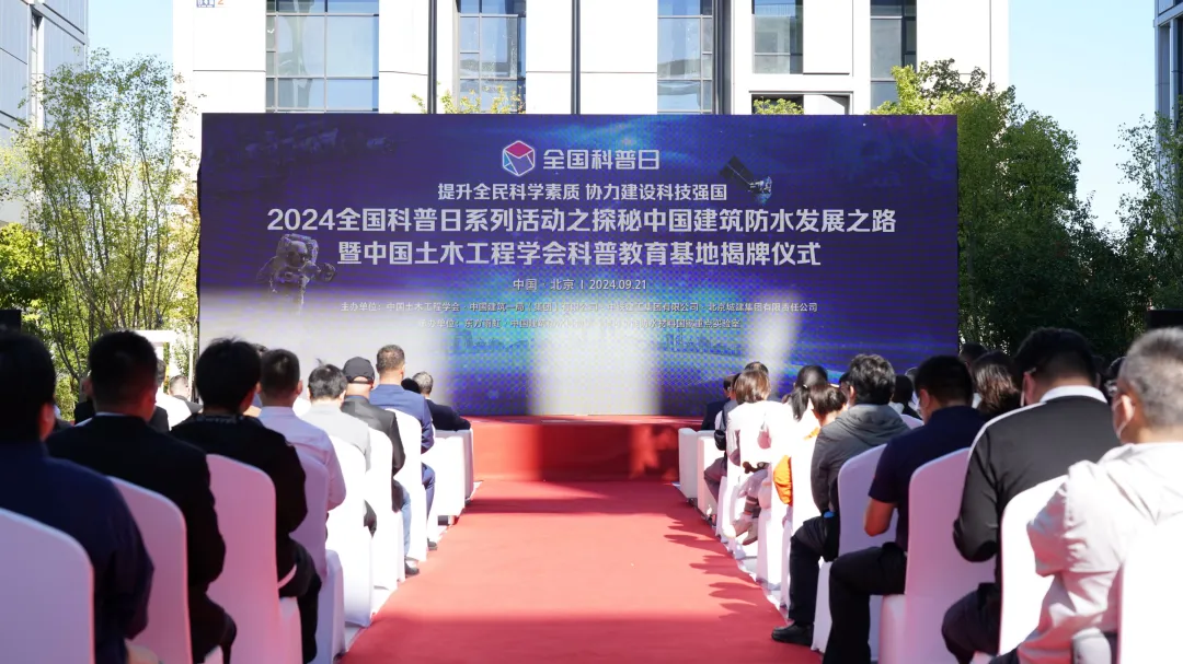9月21日,由中国土木工程学会、中国建筑一局(集团)有限公司、中铁建工集团有限公司、北京城建集团有限责任公司联合主办,东方雨虹·中国建筑防水博物馆、特种功能防水材料国家重点实验室承办的2024全国科普日系列活动之探秘中国建筑防水发展之路暨中国土木工程学会科普教育基地揭牌仪式在东方雨虹总部研发基地成功举行。