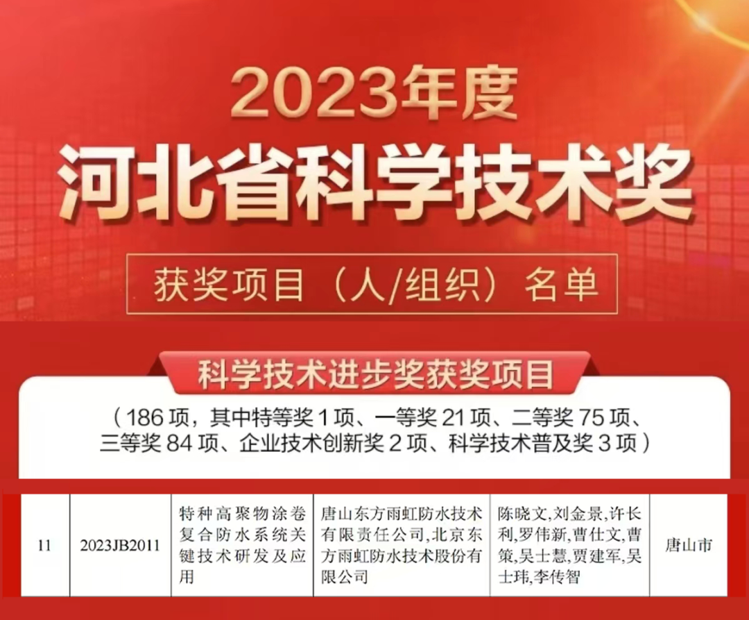 9月2日,河北省科技大会、河北省科学技术奖励大会在石家庄召开。期间,大会公布2023年度河北省科学技术奖获奖项目(人/组织)名单。由唐山东方雨虹防水技术有限责任公司、北京东方雨虹防水技术股份有限公司共同完成的特种高聚物涂卷复合防水系统关键技术研发及应用项目荣获2023年度河北省科学技术进步奖二等奖。