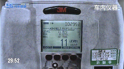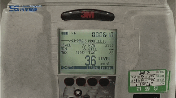 打开车门后,防护罩内高密度的颗粒物迅速进入车内,模拟人员误开车门、启动空调外循环,外部颗粒物侵入车内的场景。开启车内空调内循环模式,理想L9在短短6分13s的时间内将车内30000μg/m³浓度的颗粒物快速净化至优级空气质量(35μg/m³以下,一级空气质量标准),将车内人员的颗粒物急性暴露健康风险降低为零。