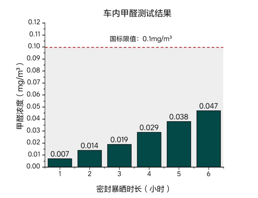 经过实验室液相色谱检测分析,理想L9在高温暴晒2小时后,车内甲醛浓度为0.014mg/m³。高温暴晒6小时后,车内甲醛浓度为0.047mg/m³,比国家室温下标准限值的一半还低。事实表明,即使在比国标严苛数倍的极限工况下,理想L9车内甲醛散发依然表现优异,证明理想L9在车内空气健康方面做到了极致的安全。