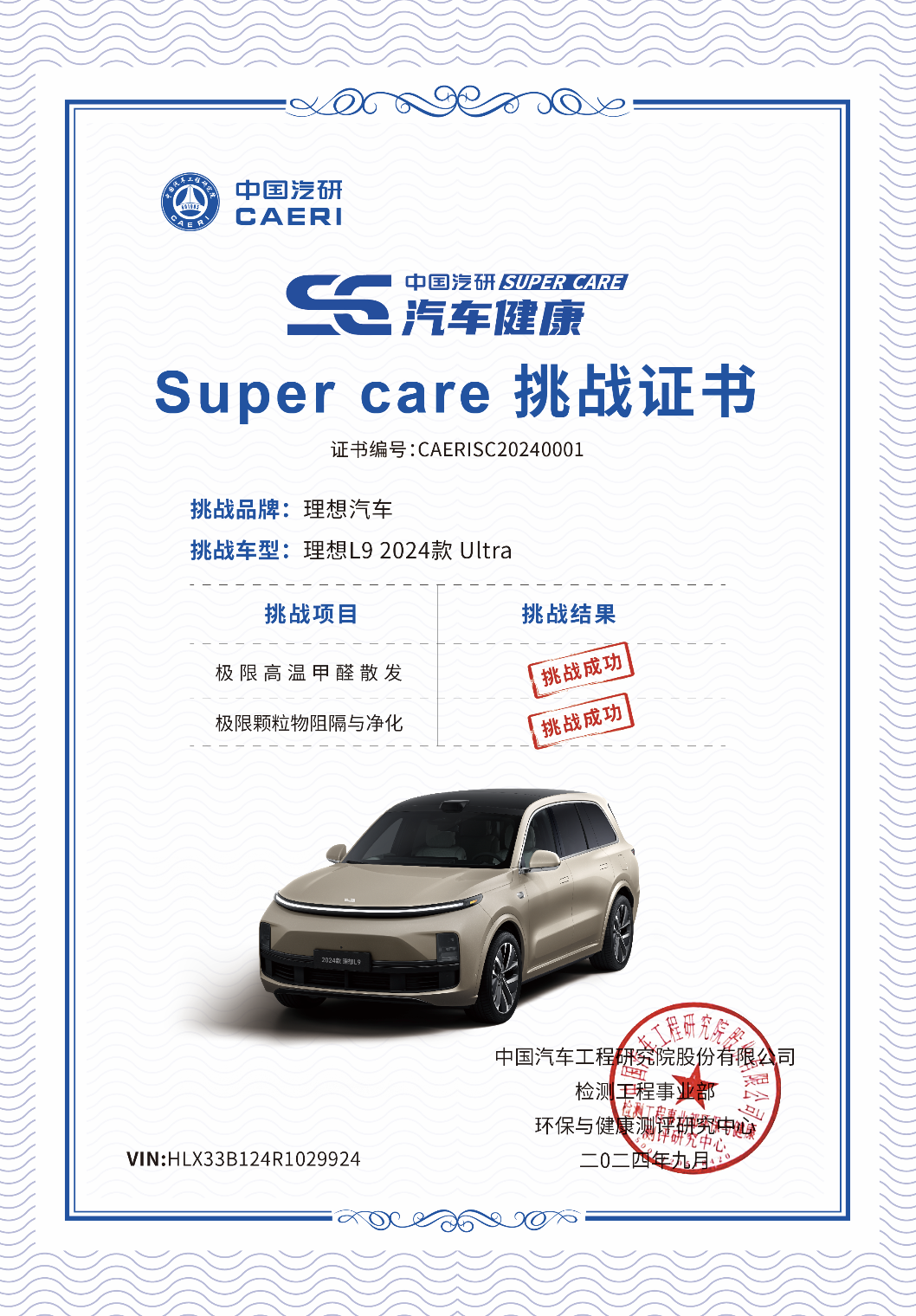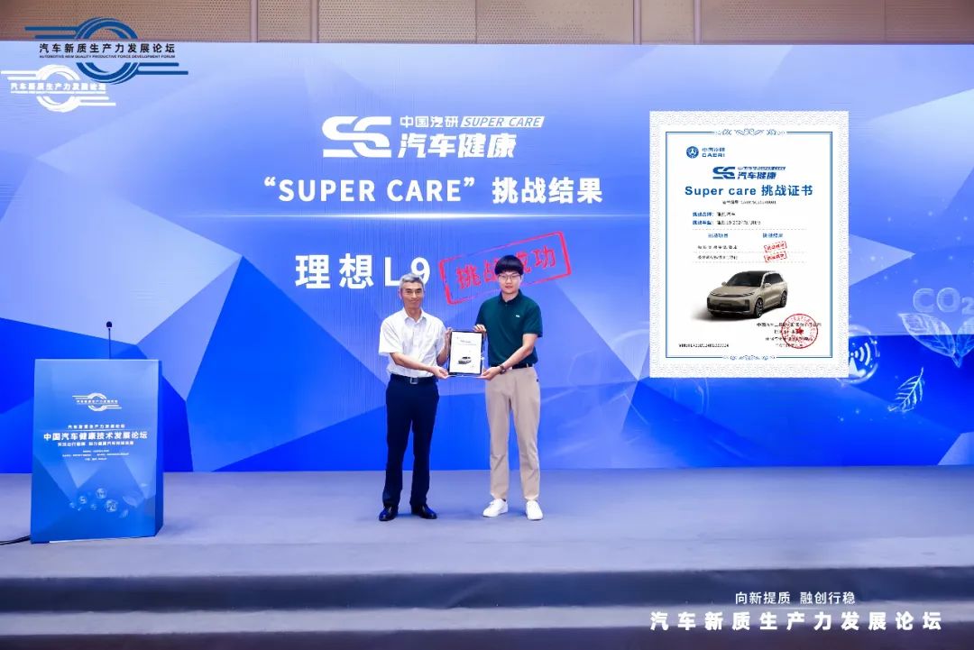 “向新提质,融创行稳”,在汽车新质生产力发展论坛上,理想L9获得中国汽研颁发的Super Care超级健康测试挑战成功证书,是本次论坛唯一荣获该项挑战证书的车型,同时,理想L9也是汽车行业首个通过Super Care超级健康测试的车型。