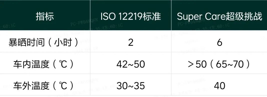 Super Care测评对车辆密闭时长和暴晒条件比行业(ISO 12219标准)要求更高,更加贴近用户实际的极致用车场景。当天阳光辐照强度超过1000W,比目前行业标准的400W强度高2倍多。