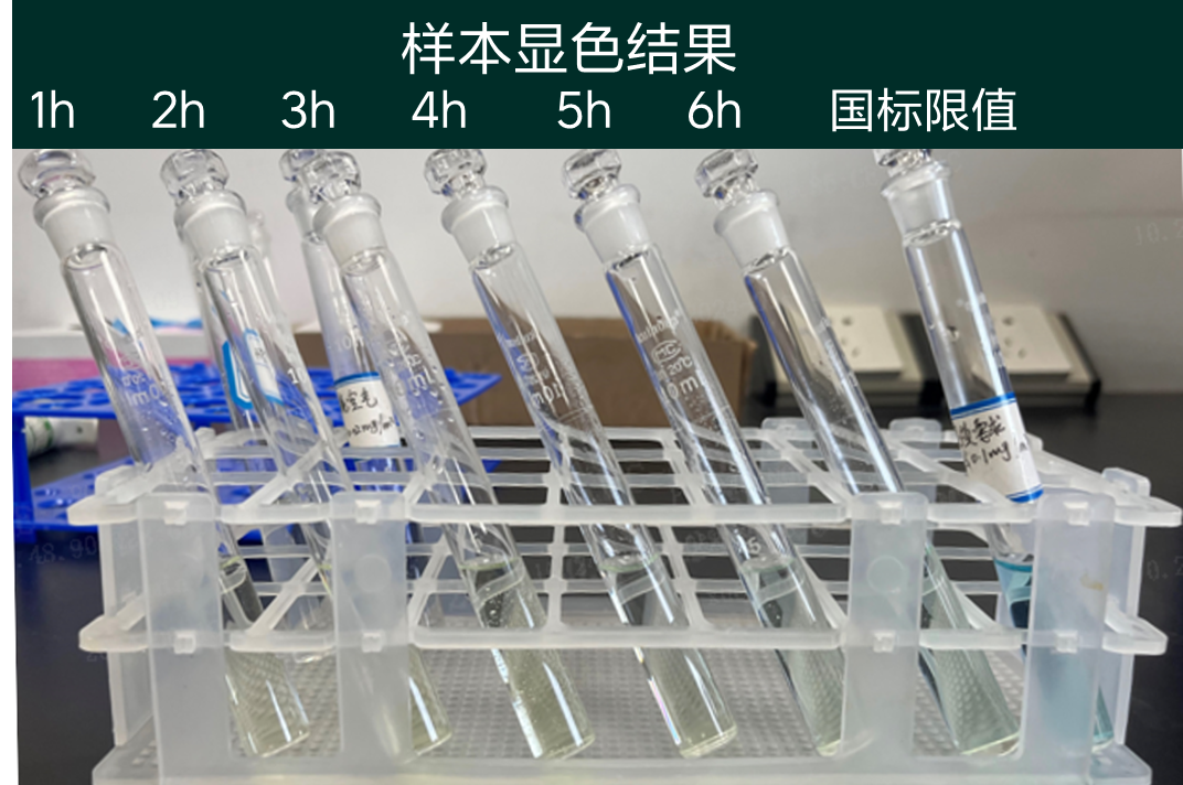 从左往右依次是6h暴晒样品、0.1mg/m³国标限值样品、空白甲醛浓度样品