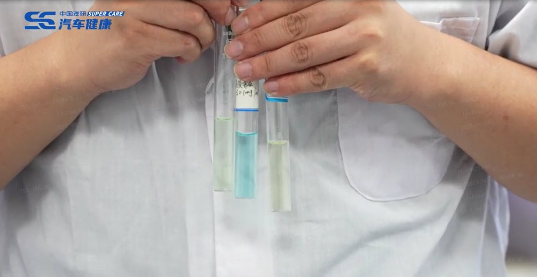 为了更加直观地观察到甲醛的浓度变化,本次测评中国汽研借鉴了室内空气甲醛的检测方法——酚试剂法进行展示。酚试剂法中样品显色颜色深浅表示甲醛浓度的强弱,颜色越蓝,浓度越高。理想L9在经历6小时高温暴晒后,车内空气样品显色为淡蓝绿色,远低于国标限值的甲醛颜色,说明车内甲醛浓度处于安全限值范围内。