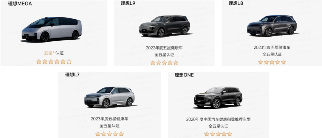 理想汽车是用户健康安全的坚定守护者。在中国汽车健康指数评价中,理想汽车所有参评车型均获得全五星认证。