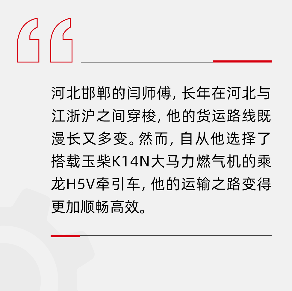 “买燃气车认准玉柴机器。”闫师傅笑着说,“它不仅帮我节省了成本,还提高了运输效率,真的是我运输路上的好帮手!”在闫师傅的推荐下,他身边越来越多的货车司机开始选择搭载玉柴K14N燃气机的货车,共同驰骋在货运的道路上。