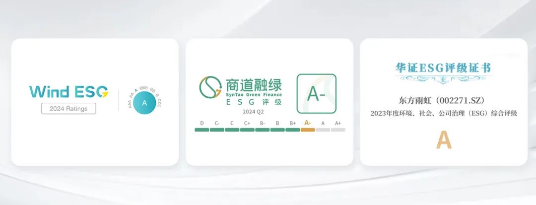 稳步提升、喜讯连连。在近期万得(Wind)、商道融绿、华证等多家国内外ESG评级机构发布的最新ESG评级结果中,东方雨虹更以良好表现频获佳绩,部分评级跃升至A级。其中,万得(wind)ESG评级由BBB上升至A,商道融绿ESG 评级由B+升至A-,华证ESG评级由BBB上升至A。