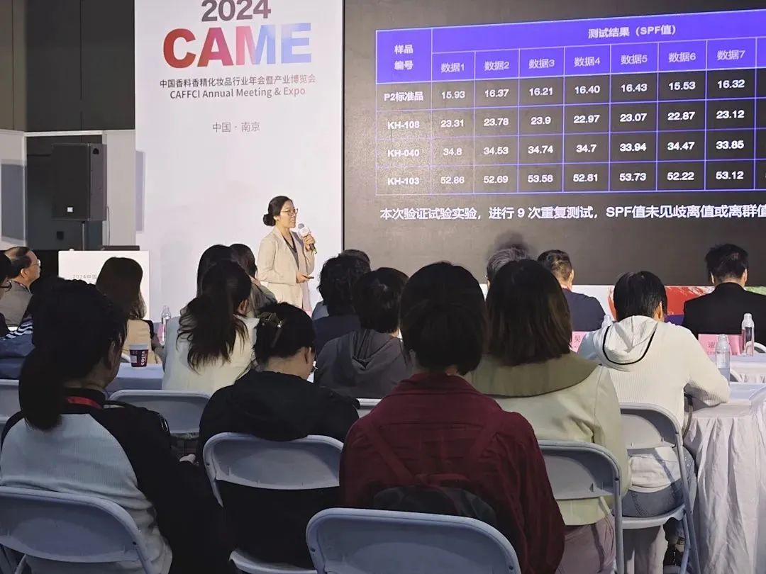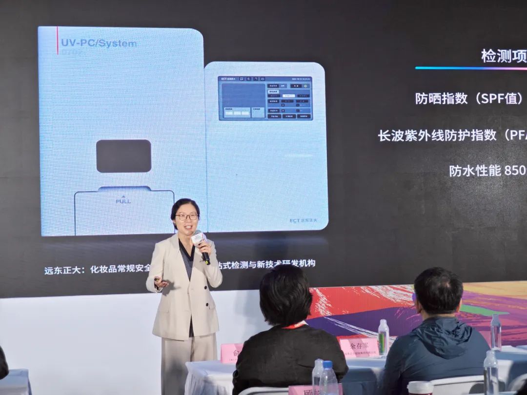 在活动现场,远东正大检验集团化妆品事业部总经理徐美龄女士对UV-PC防晒性能体外测试系统及团体标准进行了详细介绍。