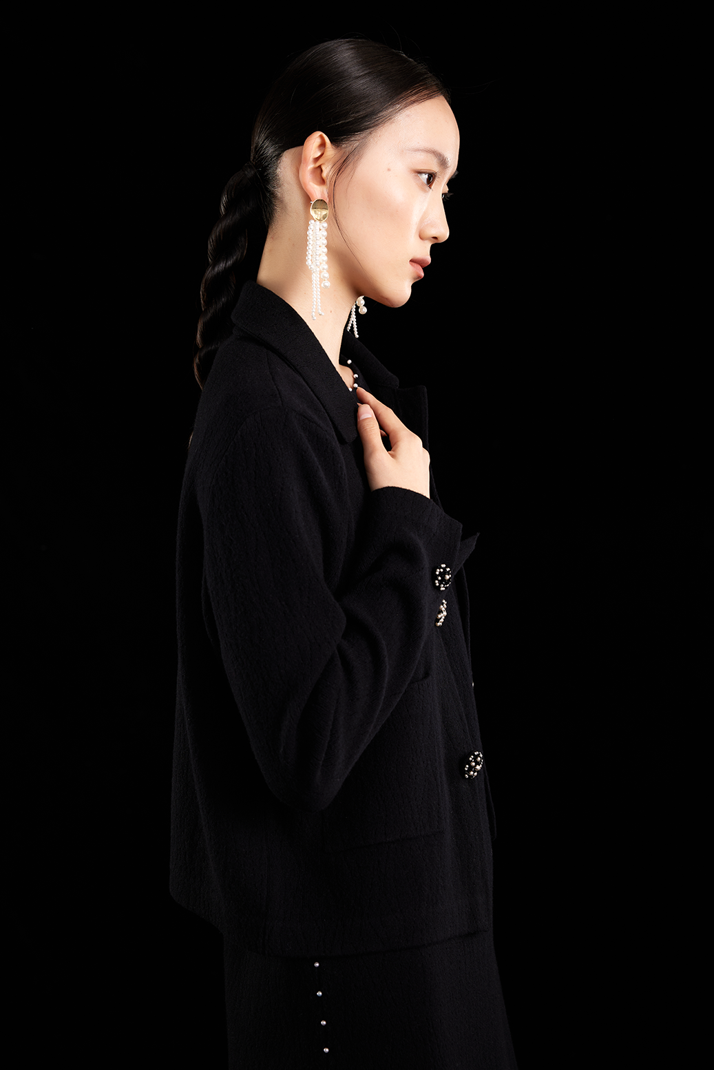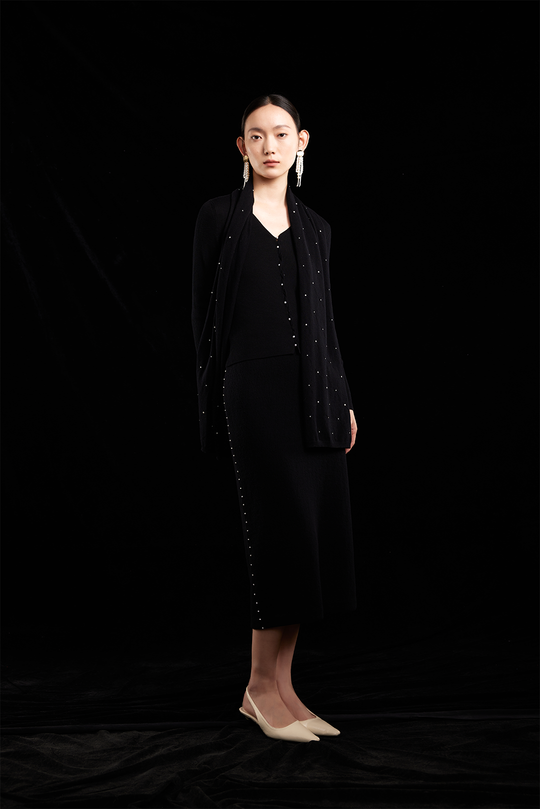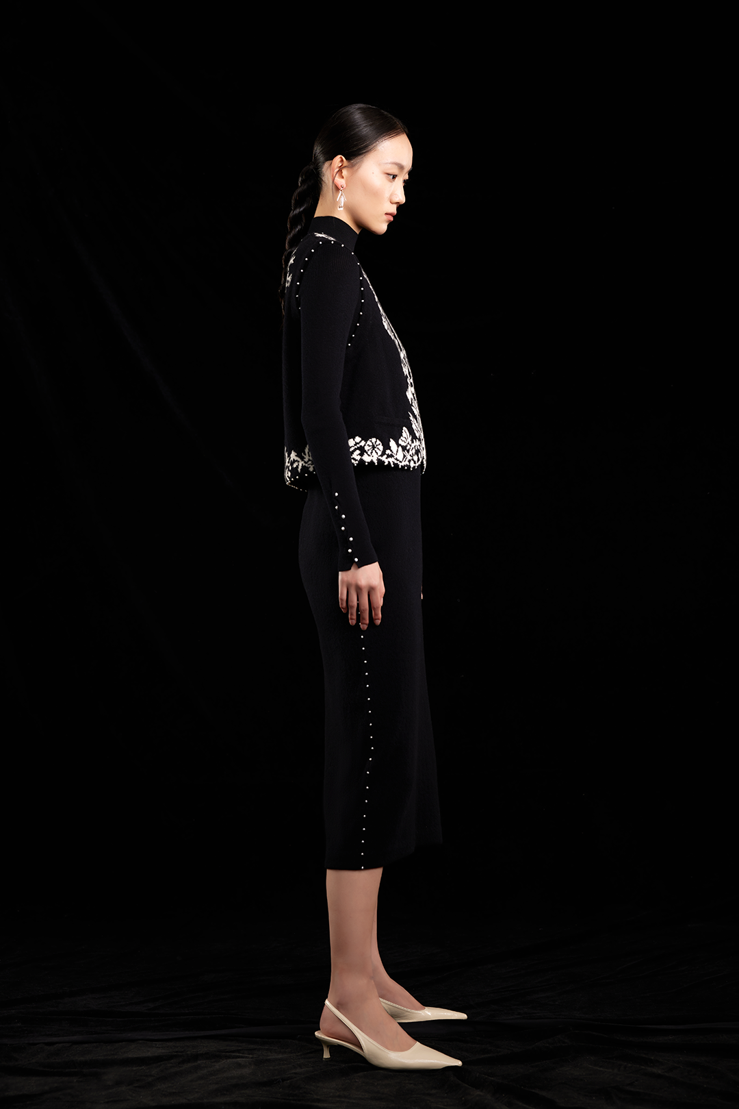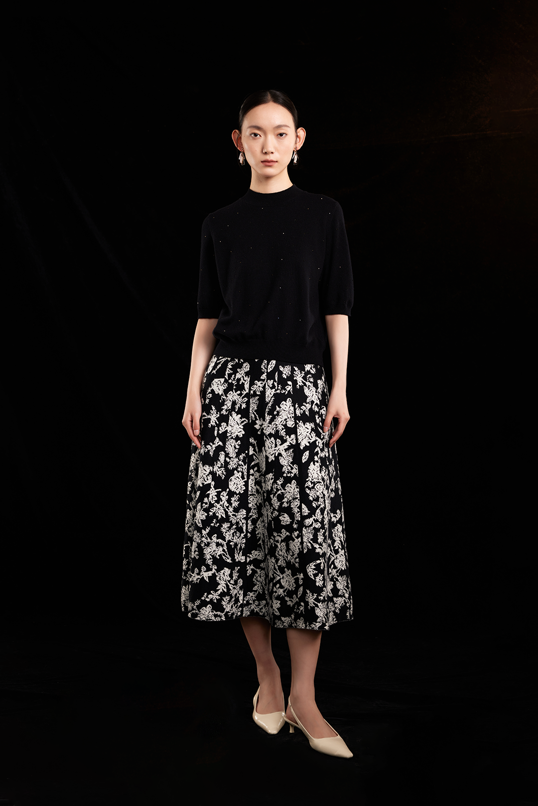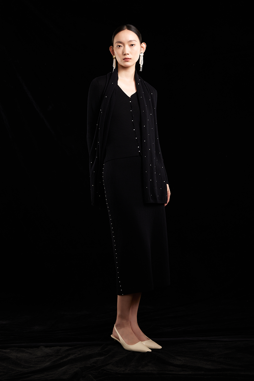精纺羊绒珍珠扣V领女衫 / 黑 / H91060 高支纱珠饰女半裙 / 黑 / H91065-1