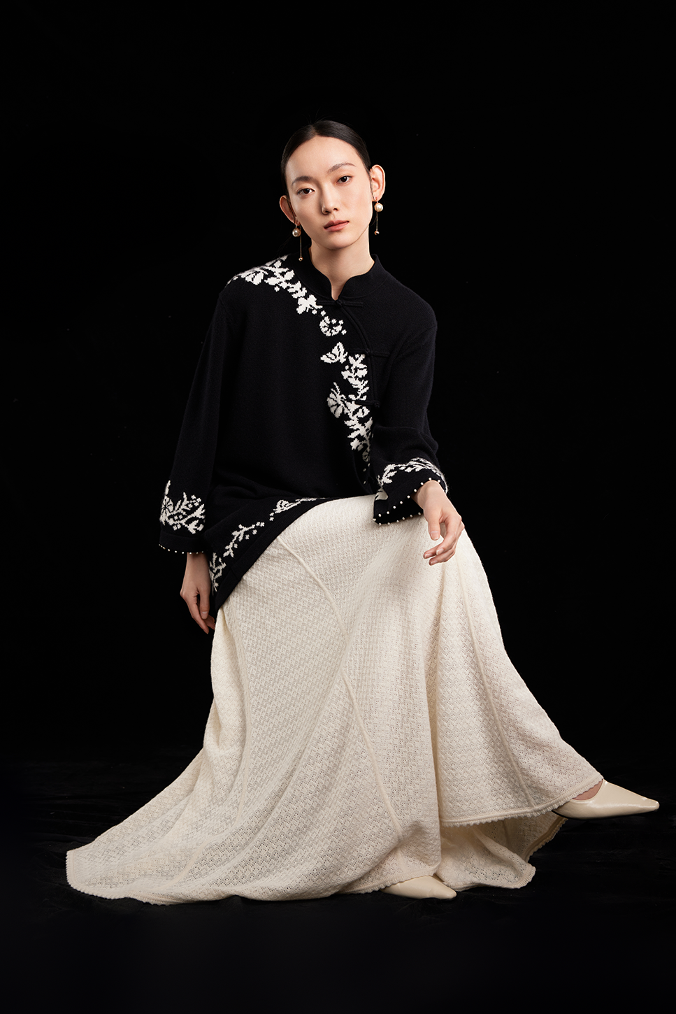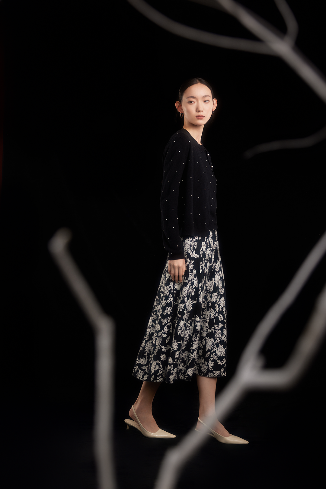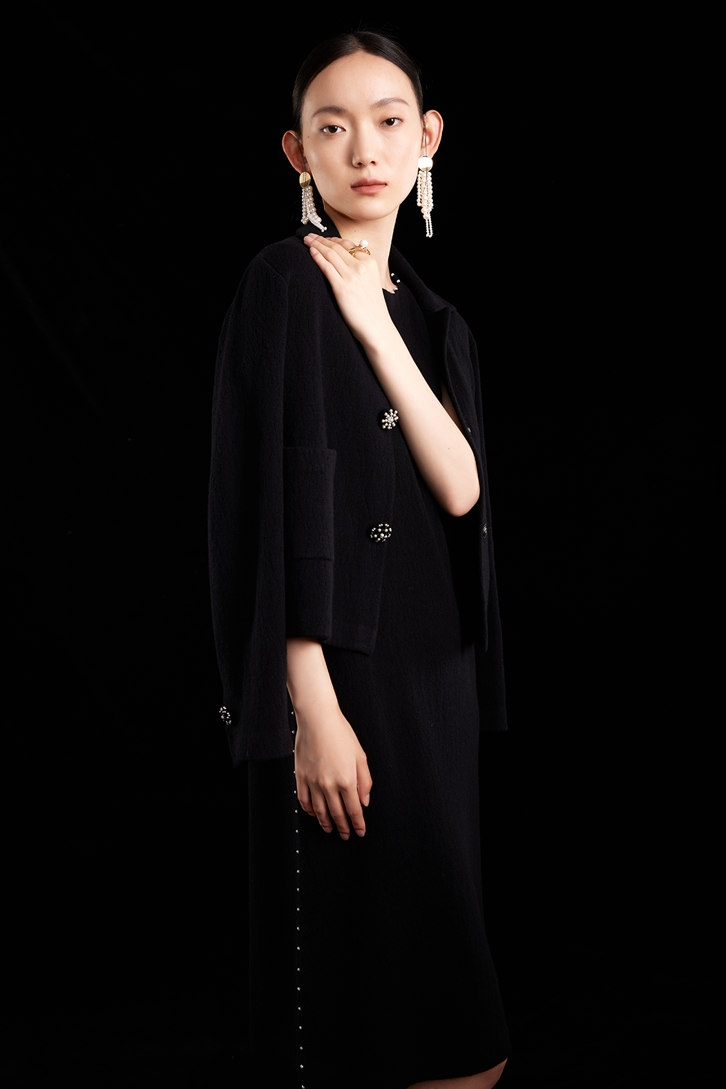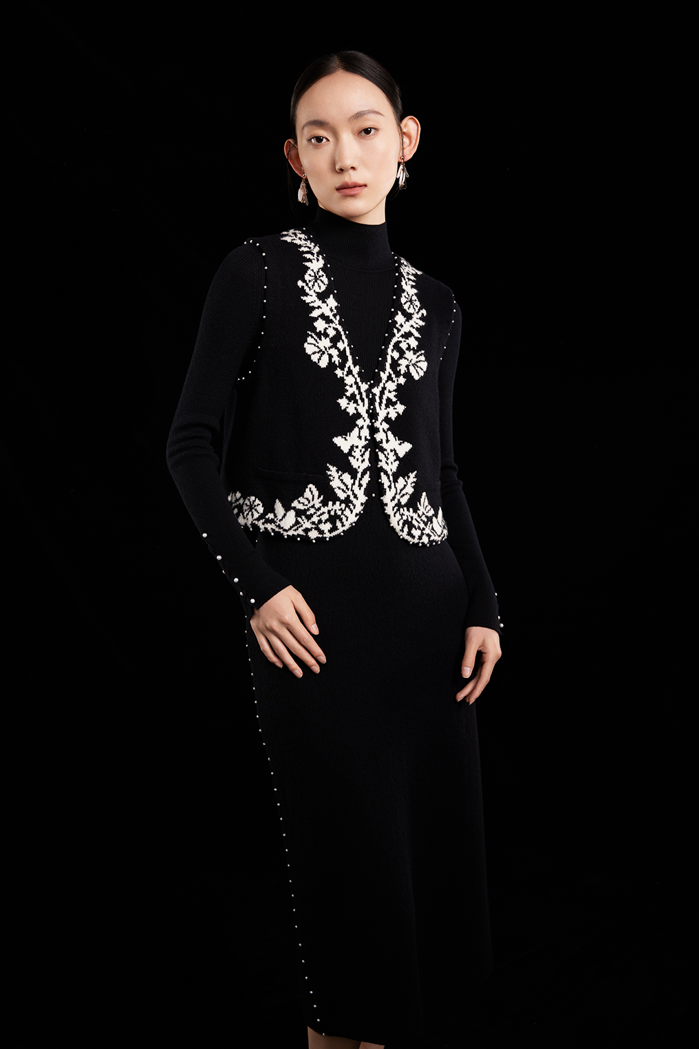 精纺羊绒珍珠扣V领女衫 / 黑 / H91060 高支纱珠饰女半裙 / 黑 / H91065-1