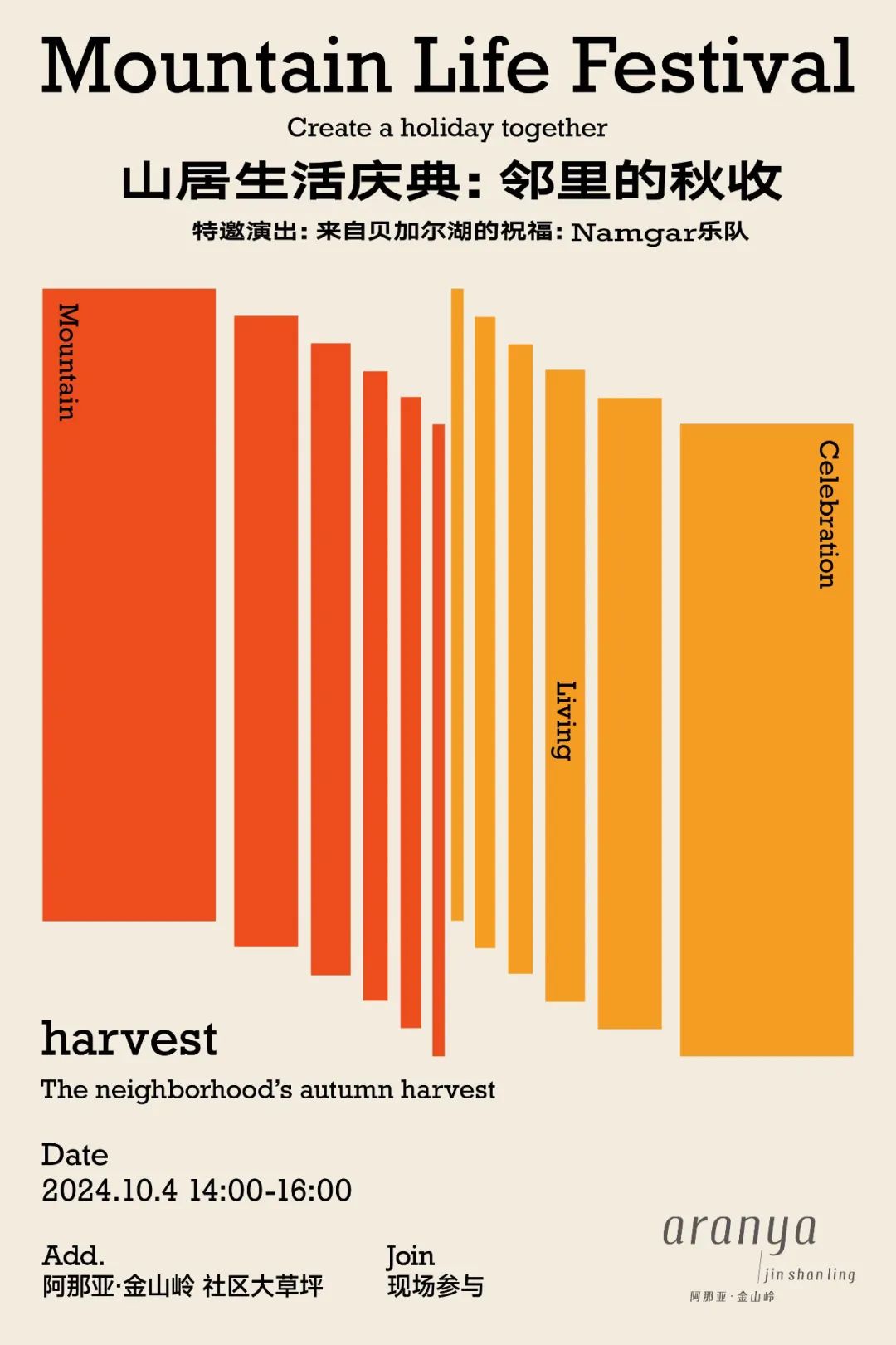 今年,阿那亚山居生活节(10月1日-10月7日)将以「创想假期,一起“秋收”」为主题,在金山岭和雾灵山开启秋日联动的度假体验。从山野到溪谷,气质多元的自然场景,将拼凑起和谐沉浸的秋日氛围!与山野共振的世界音乐,在地挖掘的“啃秋”市集&庆典,社区共创的花擂台、丰收跑、秋日山骑...…金山岭将以独具特色的生活创想,开启前所未有的“秋收”体验!与此同时,雾灵山还准备了小众乐队live、Kin-Ball&飞盘体验、声音艺术展演、植物学家分享课......丰富两山联动的更多玩法!在山野的秋天,拥抱生命最小单位的“春华秋实”,就是"丰收"于你我最美的意义。