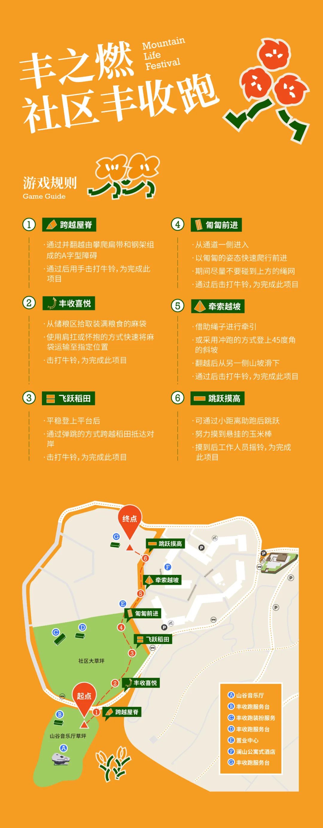 晨光破晓,山谷被一层金色的薄纱轻轻覆盖,一场激情满满的社区丰收跑将首次在金山岭举办!本次赛事共设置6个轻度障碍,全程约1.7公里,适合6-60岁全龄段人群参与。从「跨越屋脊」的攀爬挑战,「丰收喜悦」「飞跃稻田」的力量平衡,到「匍匐前进」「牵索越坡」的核心支撑,再到「跳跃摸高」的最终一跃。你的指尖、脚底乃至全身,都将与这片土地进行最亲密的对话!在出发之前,“啃秋”市集还将限时开放“装扮服务站”,为参与社区丰收跑的邻居,提供包括面部装饰、服装DIY绘画等免费服务,留下独具一格的“出片儿”回忆!