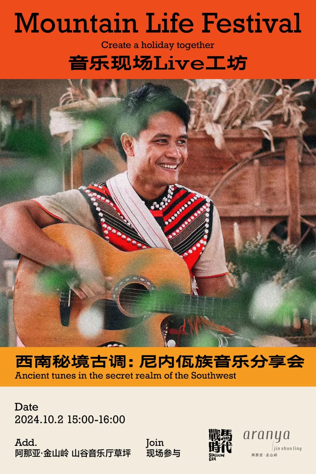 当古老的民族乐器遇上现代旋律,金山岭山居生活节将齐聚世界音乐艺术家,再次奏响原生态的野性之音,如同山谷低语,穿透喧嚣,直抵人心。它们是对秋野最真挚的赞歌,也是对生活最热情的庆祝。阳光透过稀疏的云层,撩拨着山野间淡淡的草木香,来自普洱市西盟佤族自治县的“阿倮尼”乐队,将用古老的乐器奏响西南秘境的自然之声。尼内,乐队主唱兼非遗乐器承袭者,携带着对本土文化的深刻理解和自觉,将当代流行视角与传统非遗精髓巧妙融合,呈现从四面八方游牧而来的多民族音乐。活动时间:10月2日 15:00-16:00