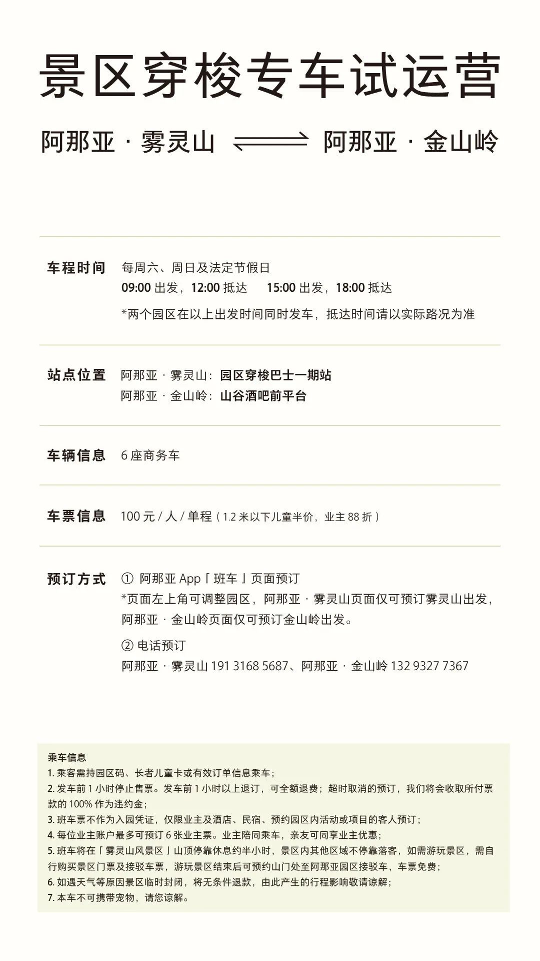 十一山居生活节期间,阿那亚·金山岭、阿那亚·雾灵山园区可预约穿山专车,实现「两山」的联动,给大家带来更便捷的度假体验!1)公共交通:在阿那亚APP「班车」板块预定车次,班车出发地:北京芍药居地铁站