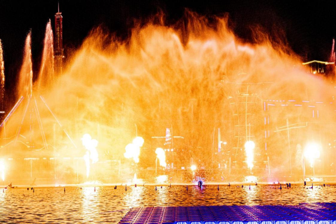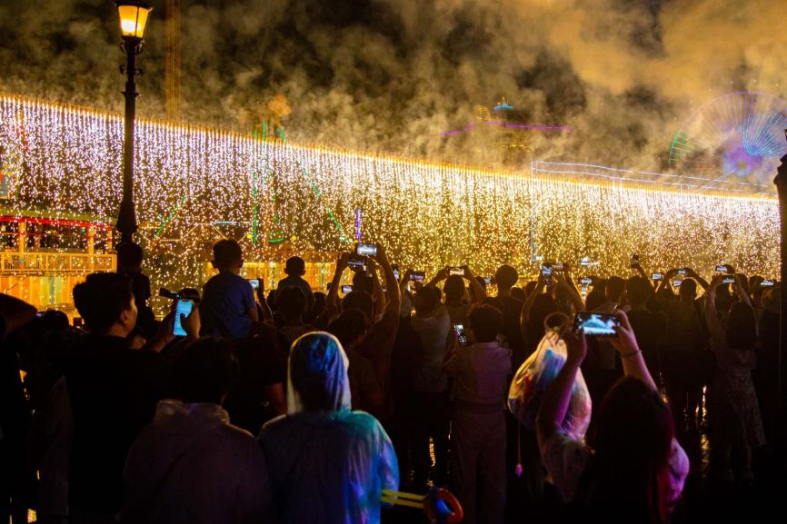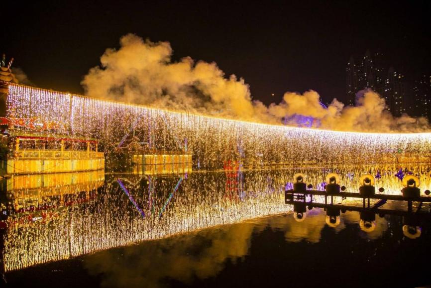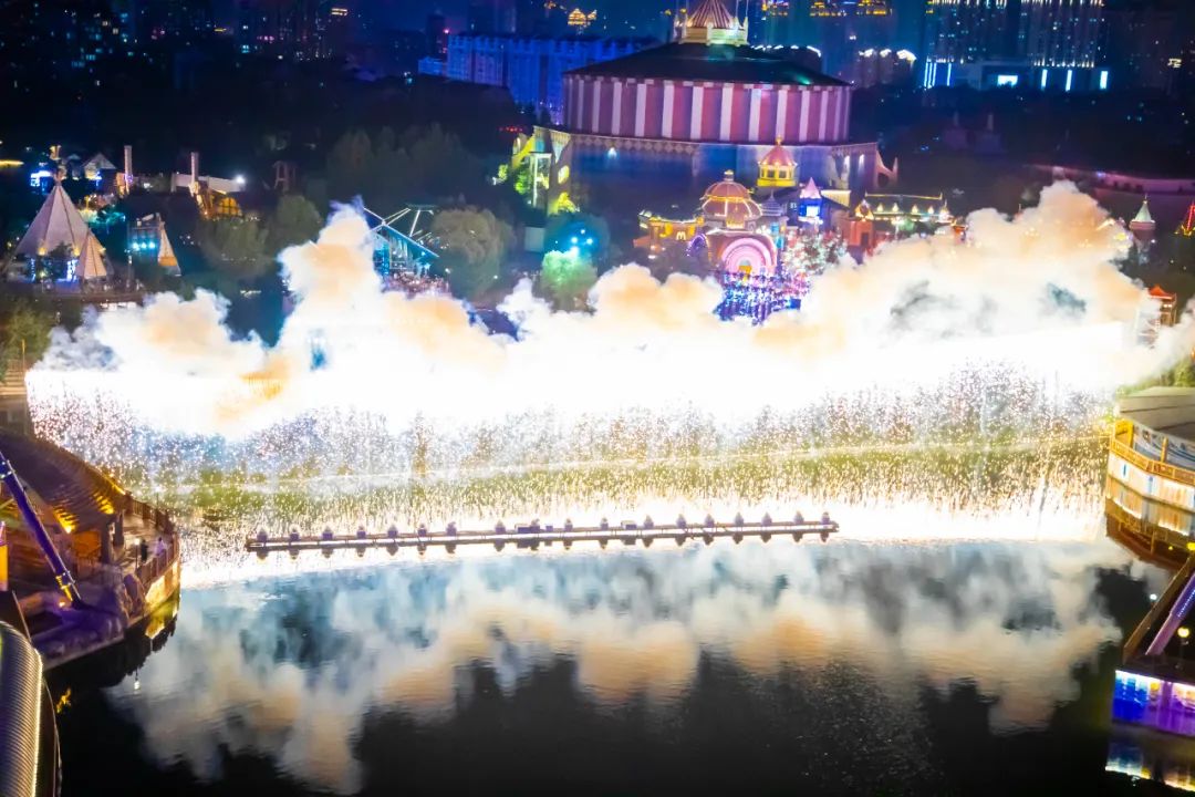 《奇幻声光秀》—大湖秀,是哈尔滨融创文旅城今年的重磅作品,它结合了当代前沿的声光投影、大规模智能水舞、立体声效、水幕等舞台技术手段,并由演艺团队精心创排而来。 为了给游客呈现出一场场令人叹为观止、绝美的百米焰火演出,哈尔滨融创团队跨越 3000 公里的距离,邀请来自湖南浏阳河的专业焰火团队,别出心裁地确定了不在高空燃放,而是向下悬挂近 1000 组燃点的独特方式,精心策划成绵延长达 200 米的焰火瀑布。 其中的一大挑战,是工作人员要横跨宽达近 200 米的辽阔湖面,把那细小却又沉重无比、近乎 90斤的钢丝绳牵引到对岸。完成这项工作,只能让钢丝绳安装人员划船作业。他们既要抵御湖面时有时无的风力保持平衡,又要在划船的过程中万分小心地穿过间距不足 3 米的喷泉设备,难度极高。但最终,融创团队还是精准地完成悬挂,保证了效果。当百米大湖焰火瀑布在园区中心大湖上缓缓开启,耀眼的焰火横跨整个湖面,似瀑布一样缓缓流淌,仿佛时间就此定格,只剩空中万千花火绽放,浪漫至极。“一场不能错过的大湖秀,看多少次都看不够”。大量游客驻足观看,并为大湖秀留下了高分好评。今年暑期,哈尔滨融创文旅城总客流量突破280万人次。人流涌动,客流量直线上升,上扬的数据印证着“尔滨”文旅的热度,彰显着“尔滨”的经济活力。