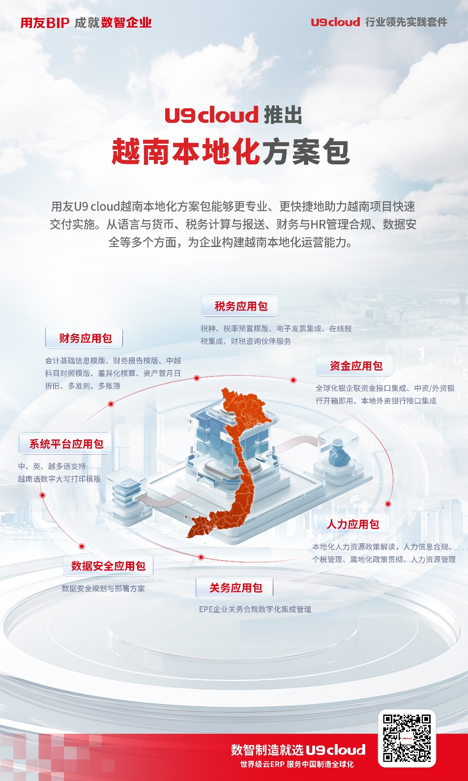 特别是越南,成为中国企业海外拓展的重要起点之一。为了帮大家更好地开拓越南市场,U9 cloud推出了越南本地方案包。从语言与货币、税务计算与报送、财务与HR管理合规、数据安全等多个方面,为企业构建本地化运营能力,还有本地化的服务机构为你保驾护航,让你的企业在越南合规经营,如鱼得水。