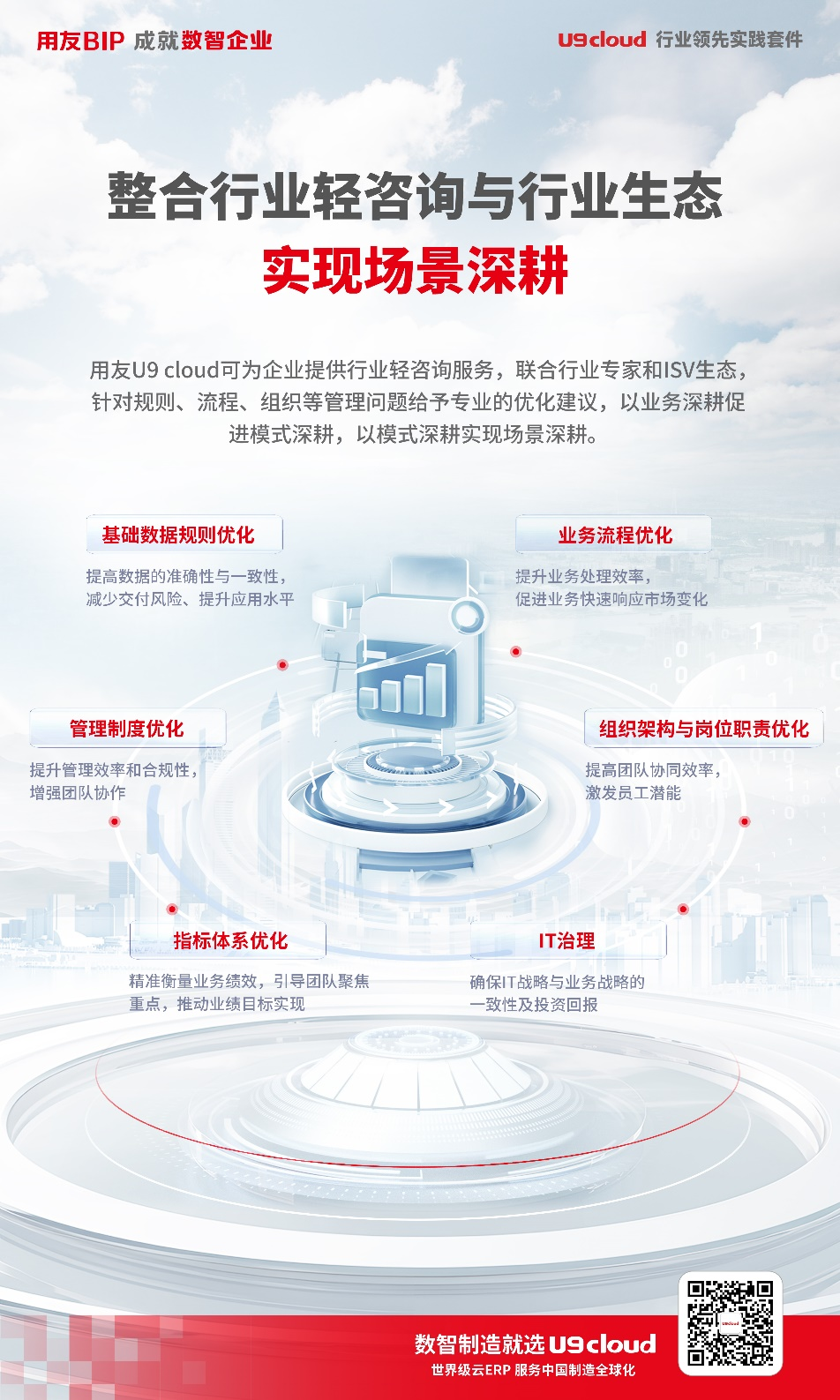此外,为了更好地满足企业数智化转型的需求,用友U9 cloud还推出了行业轻咨询服务。通过专家资源和丰富的行业经验,针对规则、流程、组织等管理问题给予专业指导与改善建议,提升交付效率与成功率,最大化ERP系统价值。正如郑瀛所讲,“‘轻’体现在时间、费用上,体现在基础管理工作的优化中。轻咨询是实现数智化深度应用的关键,能有效保障项目交付的成功率和价值。”