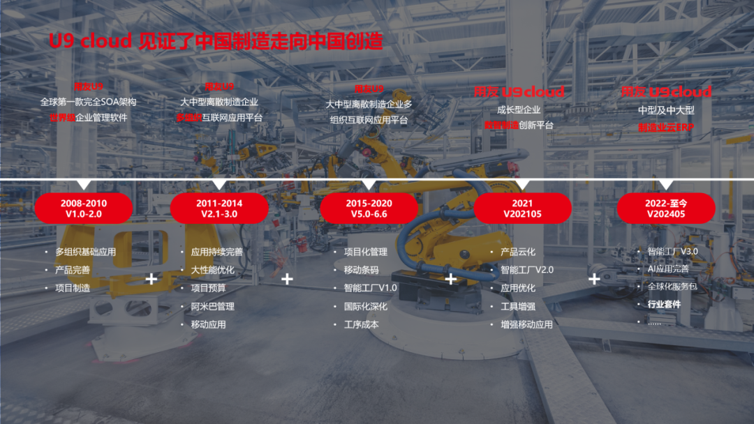 ● 行业引领(2022-至今):U9 cloud持续创新,成为世界级云ERP,服务众多中国制造企业全球化,同时,进入行业化发展阶段,通过连接更多行业生态,发布行业套件,共同适配更多行业场景。除此之外,智能工厂升级到3.0,海外服务能力也大幅加强,并紧跟AI技术的发展,不断丰富企业级AI应用。