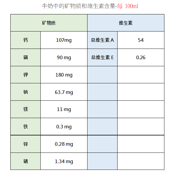 大家都知道,牛奶是我们日常营养的必需品,通过喝牛奶来补充优质的蛋白质和钙,是很多人选择牛奶的首要原因。不过,牛奶中的营养物质可不止有蛋白质和钙哦,其中还含有种类丰富的维生素和矿物质。除了钙之外,牛奶中磷、钾和钠的含量也不少,此外还有维生素A、E、B2、B12等,详见下表[1]。