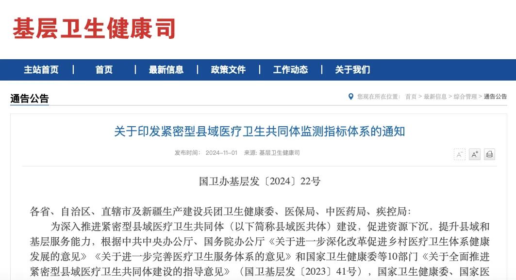 2024年11月1日,国家卫生健康委、国家医保局、国家中医药局、国家疾控局联合发布了《紧密型县域医疗卫生共同体监测指标体系(2024版)》(以下简称《指标体系》)及相关政策解读。《指标体系》供县级开展自评和省市两级开展监测评价,国家对各省份建设情况进行动态监测。文件要求,各地要加强工作指导,强化结果运用,确保县域医共体建设扎实推进,取得实效。