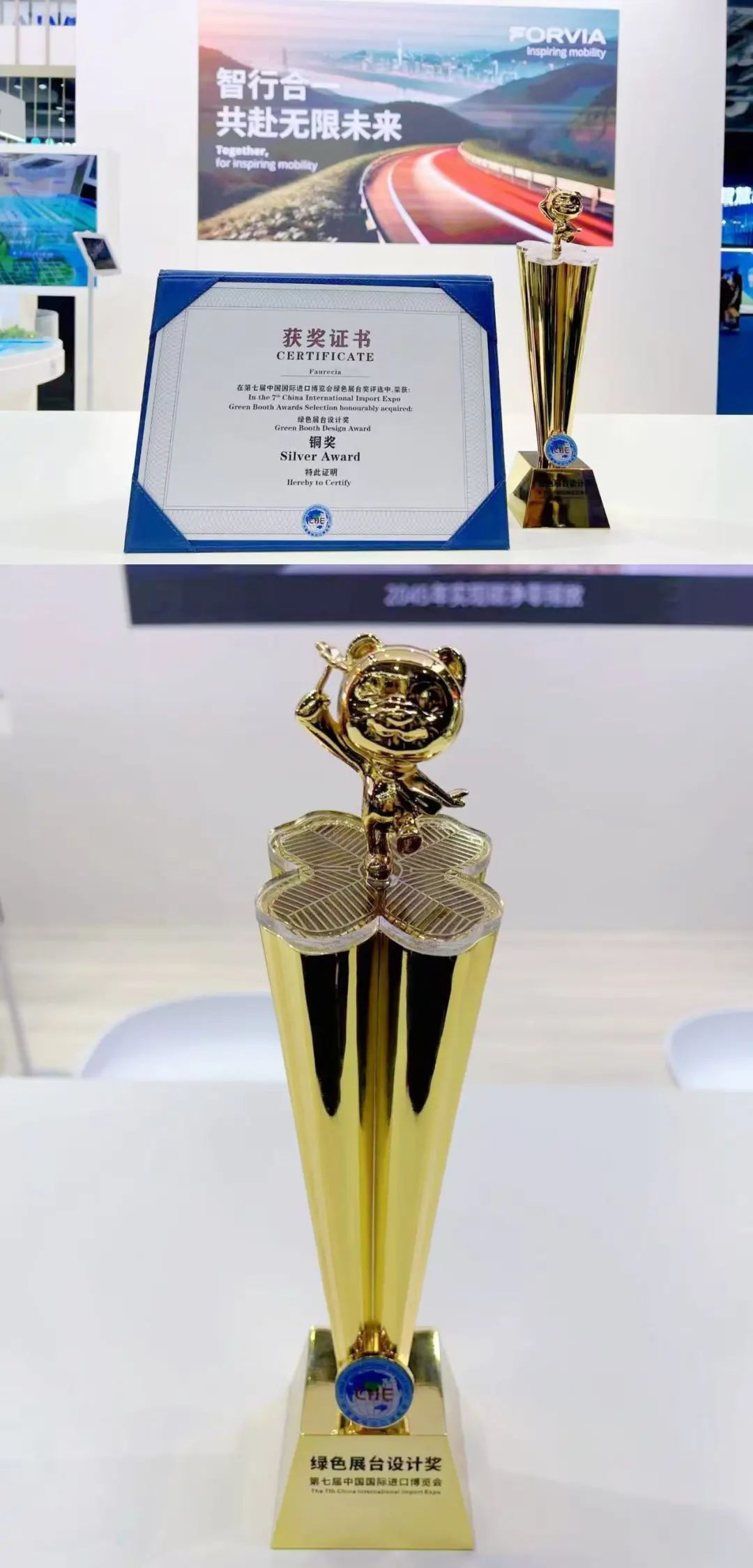 充分利用可持续材料,将集团净零排放的愿景融入设计理念,FORVIA佛瑞亚的展台荣获第七届进博会“绿色展台设计奖铜奖”,符合了进博会绿色展台在绿色设计、绿色选材、绿色安全施工的相关标准。