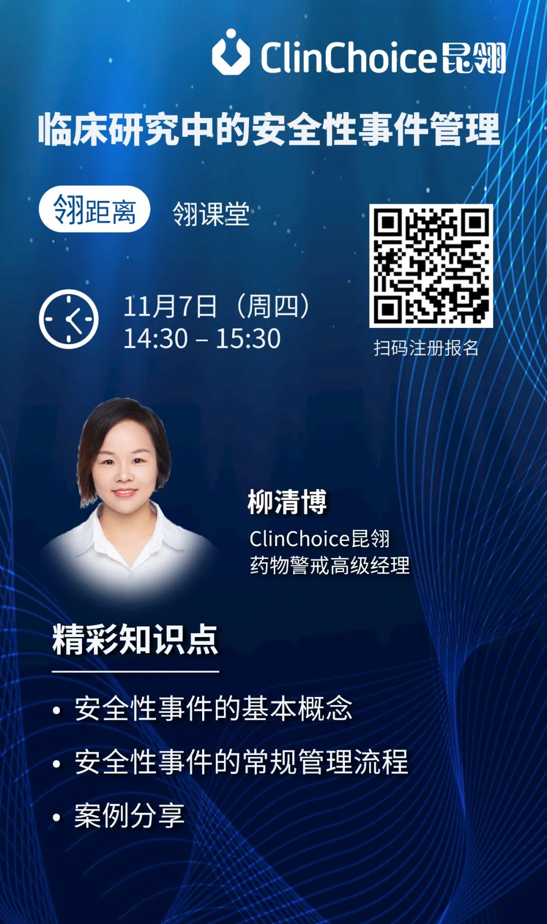 2024年11月7日(周四),ClinChoice昆翎将邀请此领域资深从业者,详细介绍安全性事件的常规管理流程,从报告、评估、随访到监控,每一步都至关重要。我们将分享昆翎在安全性事件管理方面的具体案例解读与实战经验,让大家了解如何在实践中有效应对各种安全性挑战,确保临床试验的顺利进行。如需参会,请扫描下方二维码进行注册。与昆翎一起,共筑临床研究的安全防线。