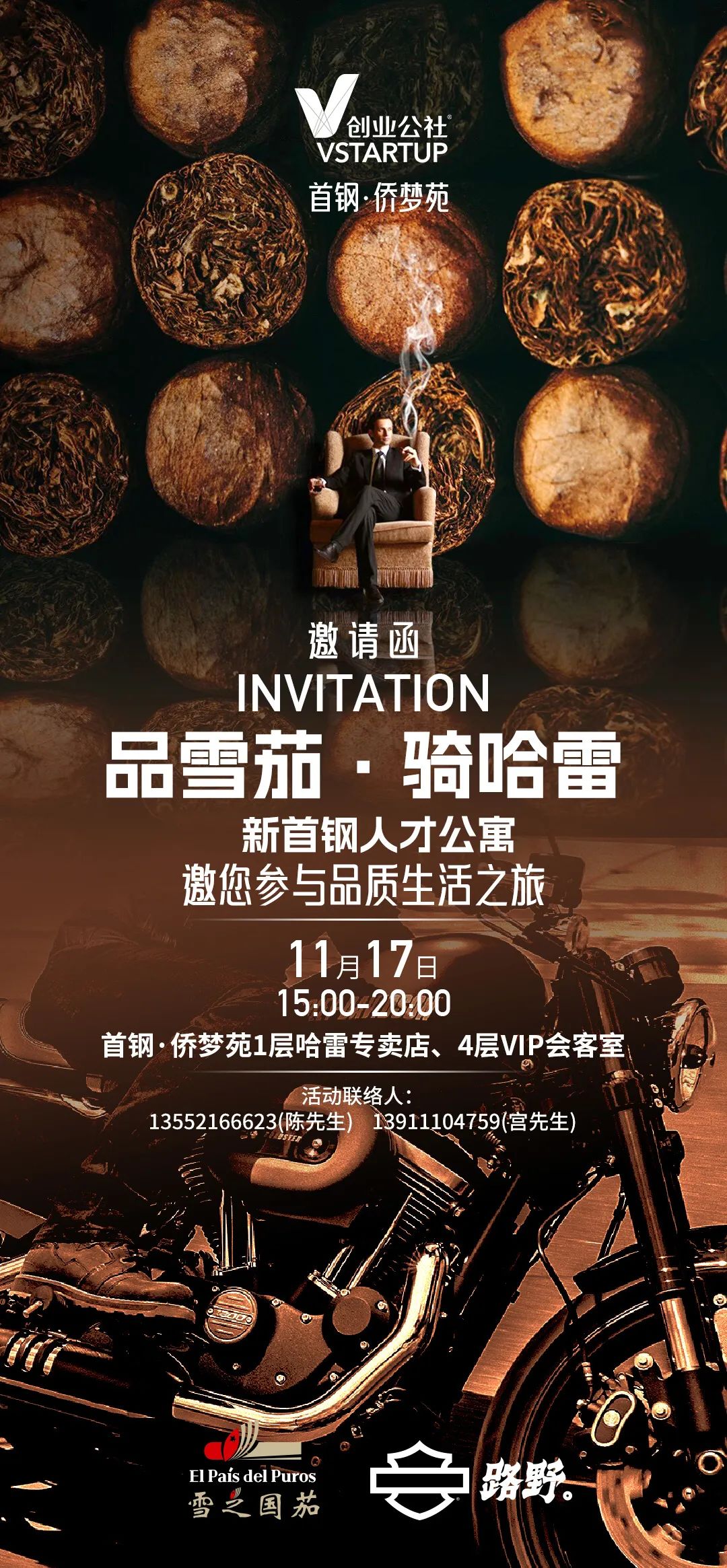 在这个周末,让我们暂时放下繁忙的工作,走进一场关于品味与自由的盛宴。无论是雪茄的沉稳内敛,还是哈雷的激情四溢,都是对生活热爱的最好诠释。本周日,我们在首钢·侨梦苑恭候您的到来,一起点燃生活的激情,驰骋在自由与梦想的道路上!