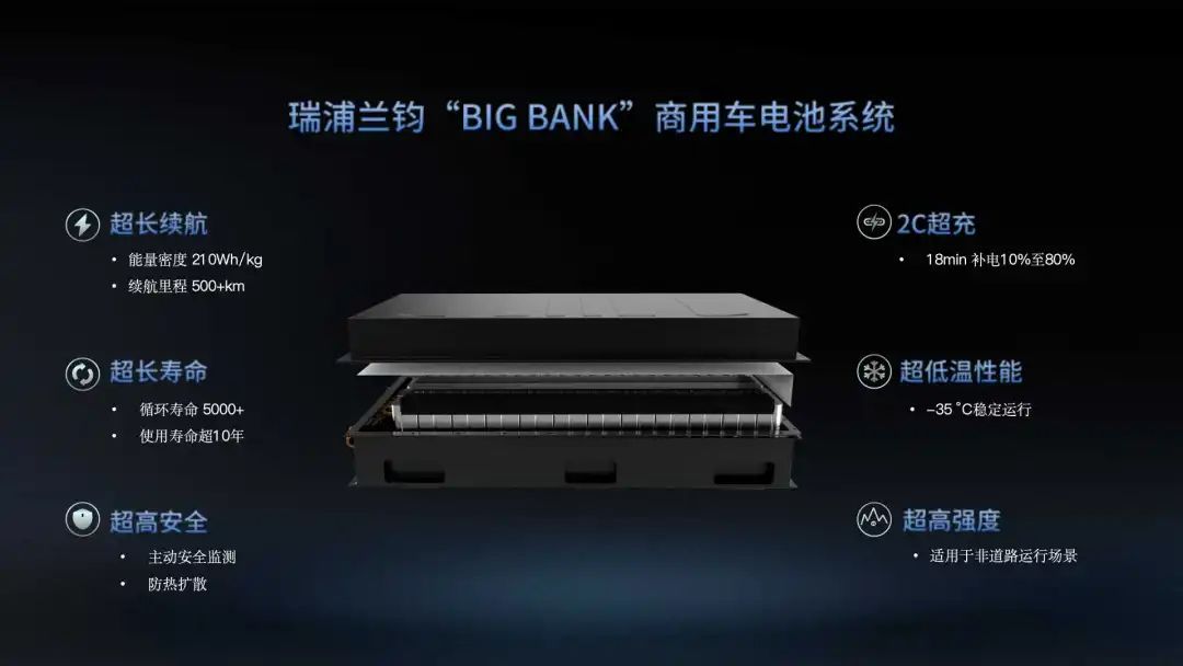 “BIG BANK”商用车电池系统具备灵活多变的组合方案,可满足重/中/轻型卡车在不同场景下的性能需求。主推500kWh系统可支持重卡车型续航里程突破500km,最长续航里程可突破600km;具备2C快充性能,18min可实现10%-80%快速补;循环寿命高达5000次以上,使用寿命超10年。