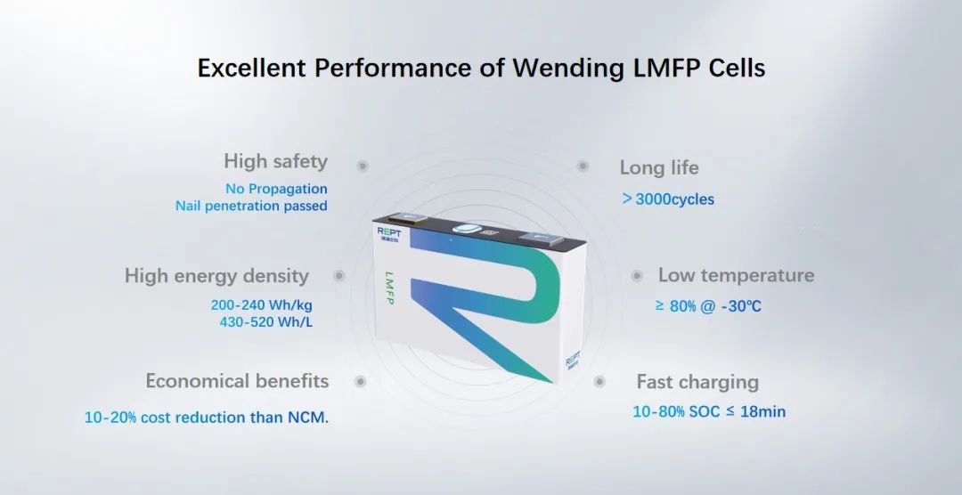 瑞浦兰钧推出的LMFP电池综合了LFP电池和NCM电池的优势性能,叠加瑞浦兰钧独创的Wending®技术后,电芯体积能量密度最高可达520Wh/L;电芯阻抗降低16%,减少多余热量产生;保证-30℃下放电容量保持率仍能达到80%以上;实现10-80%SOC 小于18min的快充能力。