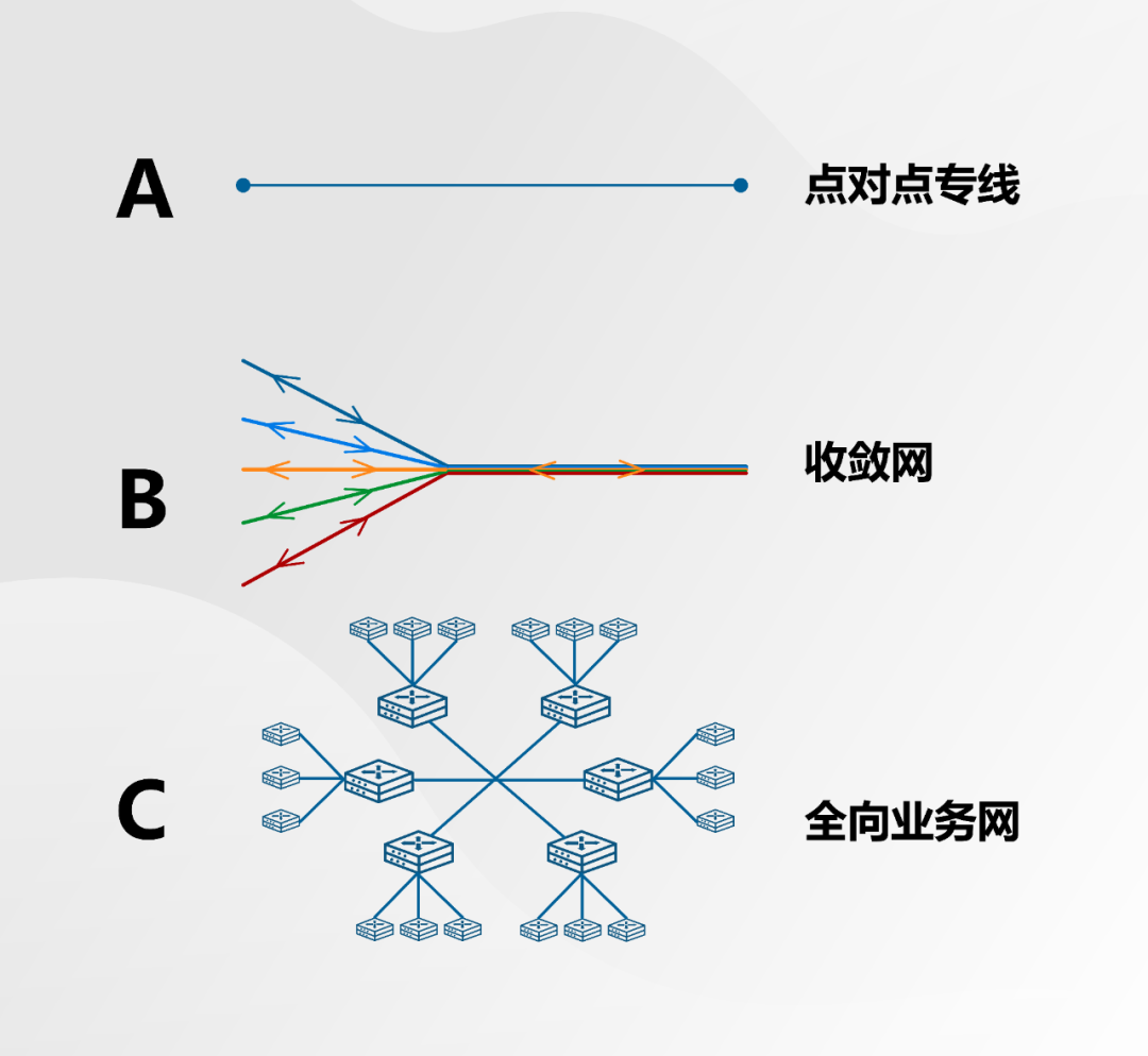 在各类数据传输业务中一般涉及以下三种形式(见下图):A类是点对点传输的专线形式;B类是多对一的“收敛网”;C类是除A、B外的混杂交叉式全业务网。