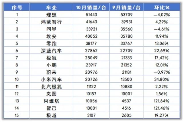 可以看出10月份阿维塔销量大增,而阿维塔是华为汽车模式中的HI模式,即服务商模式,是华为与长安汽车与宁德时代的合作品牌。